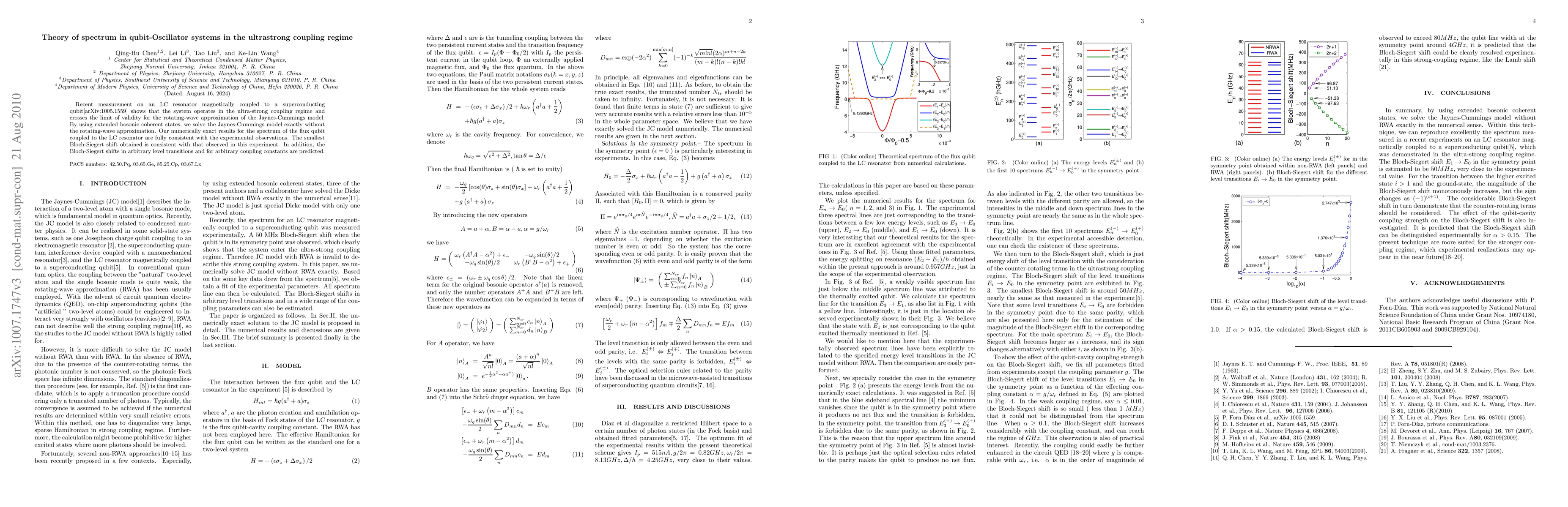 Recent measurement on an LC resonator magnetically coupled to a superconducting qubit[arXiv:1005.1559] shows that the system operates in the ultra-strong coupling regime and crosses the limit of validity for the rotating-wave approximation of the Jaynes-Cummings model. By using extended bosonic coherent states, we solve the Jaynes-Cummings model exactly without the rotating-wave approximation. Our numerically exact results for the spectrum of the flux qubit coupled to the LC resonator are fully consistent with the experimental observations. The smallest Bloch-Siegert shift obtained is consistent with that observed in this experiment. In addition, the Bloch-Siegert shifts in arbitrary level transitions and for arbitrary coupling constants are predicted.
