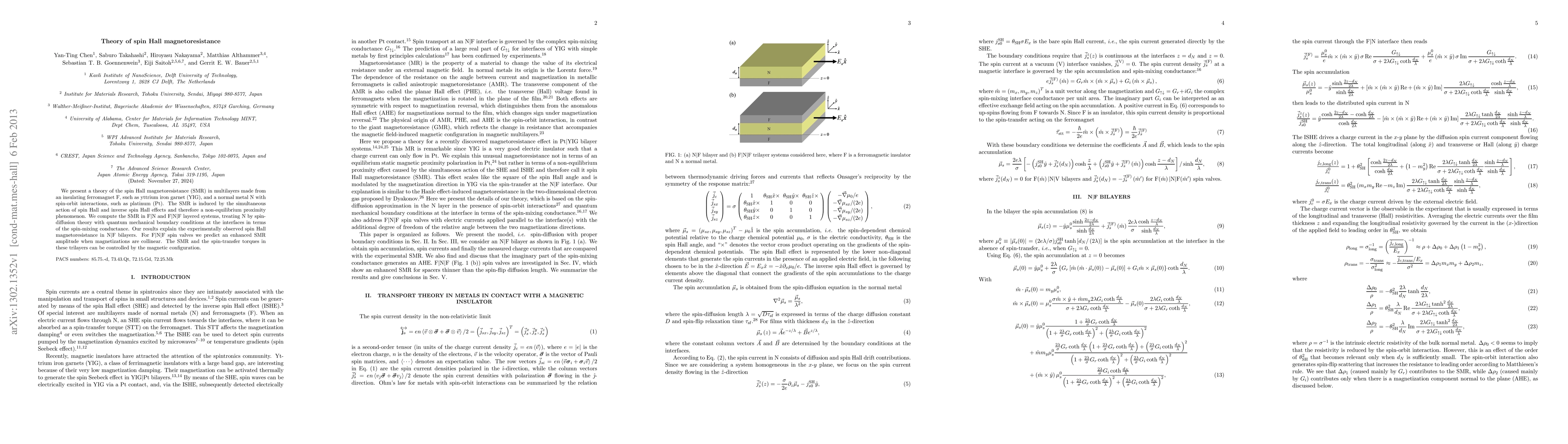 This paper develops a theoretical framework for spin Hall magnetoresistance (SMR) in multilayers composed of an insulating ferromagnet (e.g., YIG) and a normal metal (e.g., Pt) with spin-orbit interactions. It predicts enhanced SMR in trilayer systems with collinear magnetizations and explains observed SMR in bilayers through spin-diffusion theory.