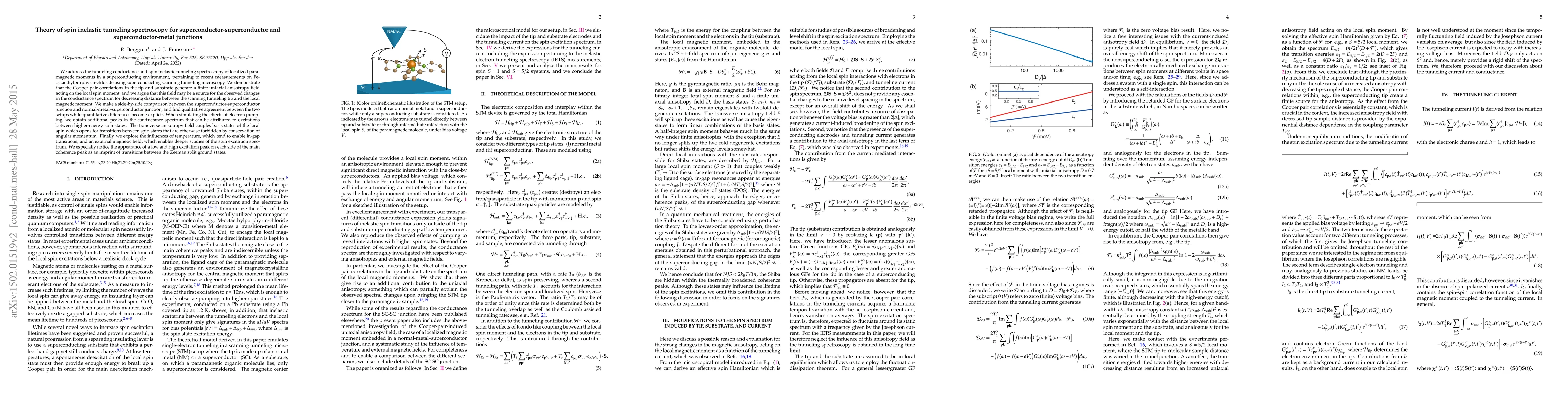 We address the tunneling conductance and spin inelastic tunneling spectroscopy of localized paramagnetic moments in a superconducting environment, pertaining to recent measurements on Fe-octaethylporphyrin-chloride using superconducting scanning tunneling microscopy. We demonstrate that the Cooper pair correlations in the tip and substrate generate a finite uniaxial anisotropy field acting on the local spin moment, and we argue that this field may be a source for the observed changes in the conductance spectrum for decreasing distance between the scanning tunneling tip and the local magnetic moment. We make a side-by-side comparison between the superconductor-superconductor junction and normal-metal--superconductor junction, and find qualitative agreement between the two setups while quantitative differences become explicit. When simulating the effects of electron pumping, we obtain additional peaks in the conductance spectrum that can be attributed to excitations between higher-energy spin states. The transverse anisotropy field couples basis states of the local spin which opens for transitions between spin states that are otherwise forbidden by conservation of angular momentum. Finally, we explore the influences of temperature, which tend to enable in-gap transitions, and an external magnetic field, which enables deeper studies of the spin excitation spectrum. We especially notice the appearance of a low and high excitation peak on each side of the main coherence peak as an imprint of transitions between the Zeeman split ground states.