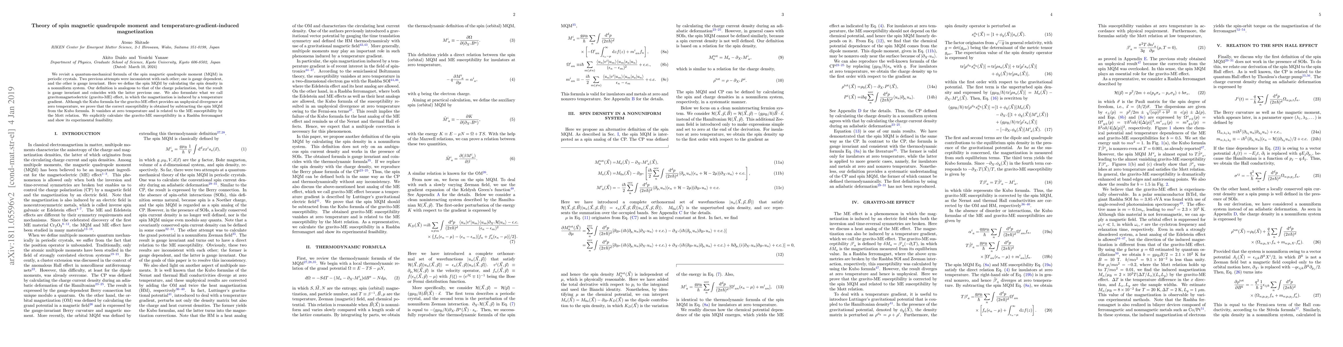 This paper defines a gauge-invariant quantum-mechanical formula for the spin magnetic quadrupole moment in periodic crystals, resolving inconsistencies in previous models. It also introduces the gravitomagnetoelectric effect, where magnetization is induced by a temperature gradient, and demonstrates its feasibility in a Rashba ferromagnet.
