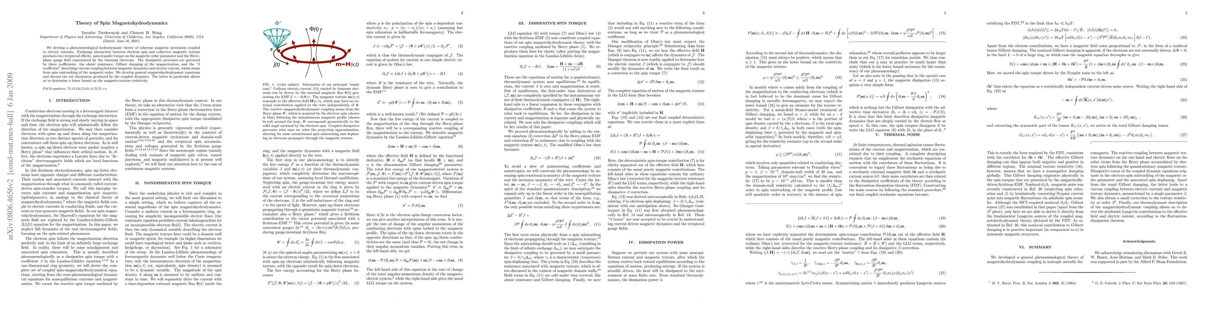 We develop a phenomenological hydrodynamic theory of coherent magnetic precession coupled to electric currents. Exchange interaction between electron spin and collective magnetic texture produces two reciprocal effects: spin-transfer torque on the magnetic order parameter and the Berry-phase gauge field experienced by the itinerant electrons. The dissipative processes are governed by three coefficients: the ohmic resistance, Gilbert damping of the magnetization, and the "beta coefficient" describing viscous coupling between magnetic dynamics and electric current, which stems from spin mistracking of the magnetic order. We develop general magnetohydrodynamic equations and discuss the net dissipation produced by the coupled dynamics. The latter in particular allows us to determine a lower bound on the magnetic-texture resistivity.