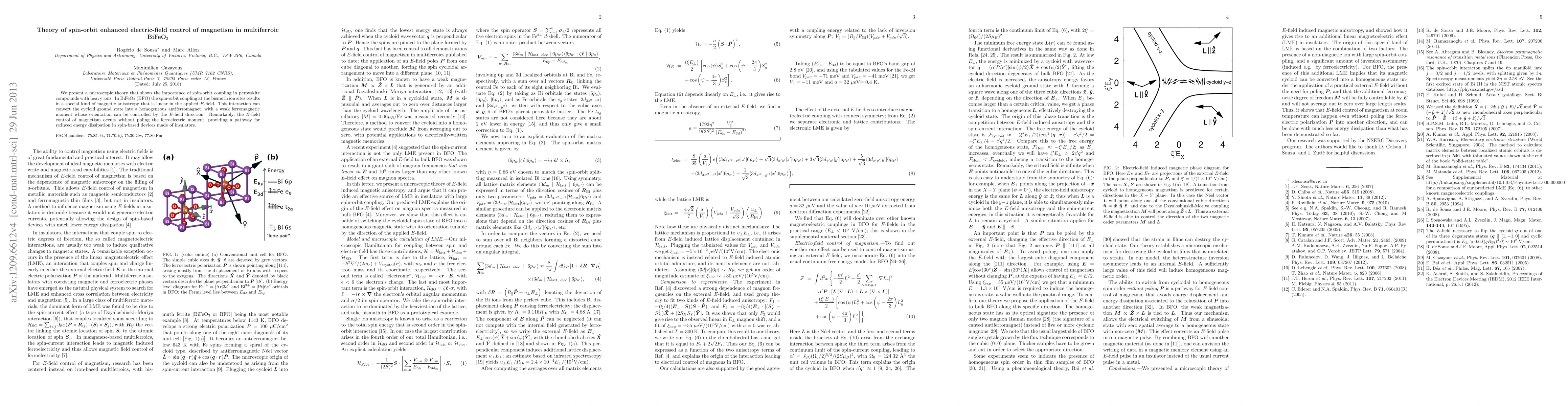 This paper develops a microscopic theory highlighting the role of spin-orbit coupling in perovskite multiferroic BiFeO3, showing that it enables electric-field control of magnetism without altering the ferroelectric state, potentially reducing energy dissipation in spintronic devices.
