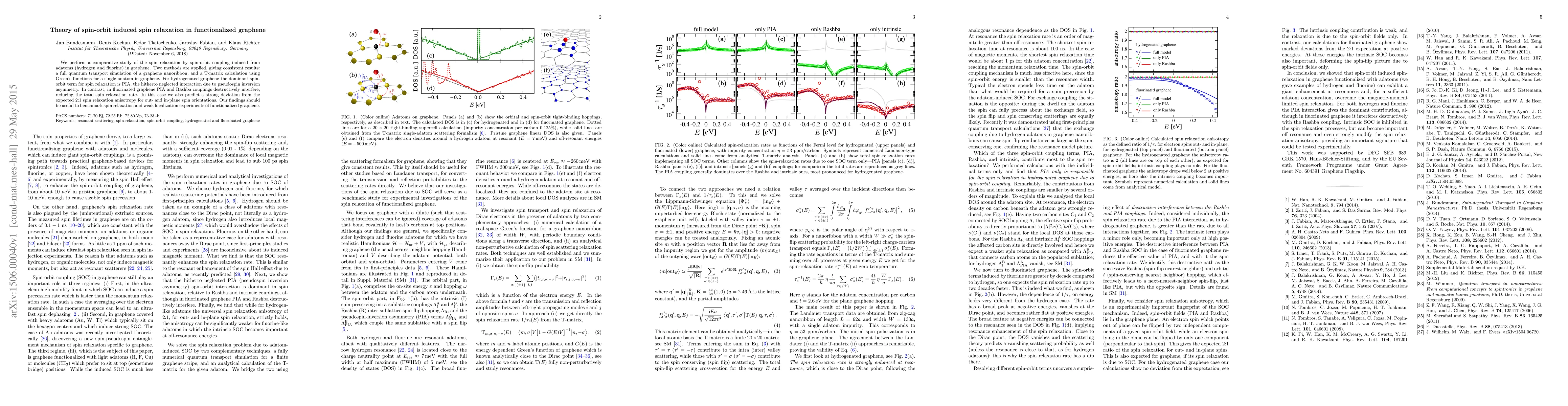 This paper investigates spin relaxation mechanisms in graphene functionalized with hydrogen and fluorine, revealing that PIA is the dominant spin-orbit term for spin relaxation in hydrogenated graphene, while in fluorinated graphene, PIA and Rashba couplings interfere, leading to reduced spin relaxation and altered anisotropy.