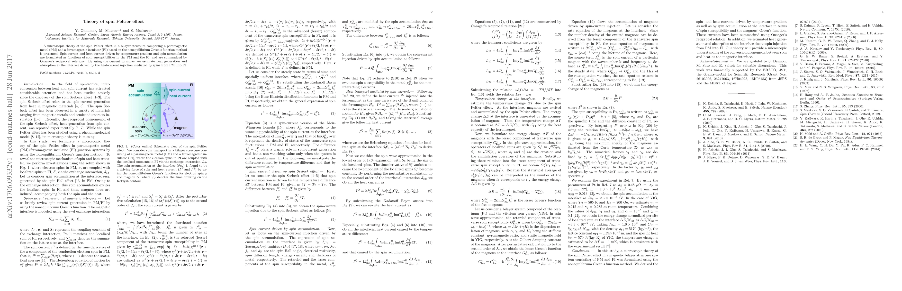 This paper presents a microscopic theory of the spin Peltier effect in a bilayer structure of paramagnetic metal and ferromagnetic insulator, using nonequilibrium Green's functions. It formulates spin current and heat current driven by temperature gradients and spin accumulation, and estimates heat generation/absorption at the interface due to spin-mediated heat current.