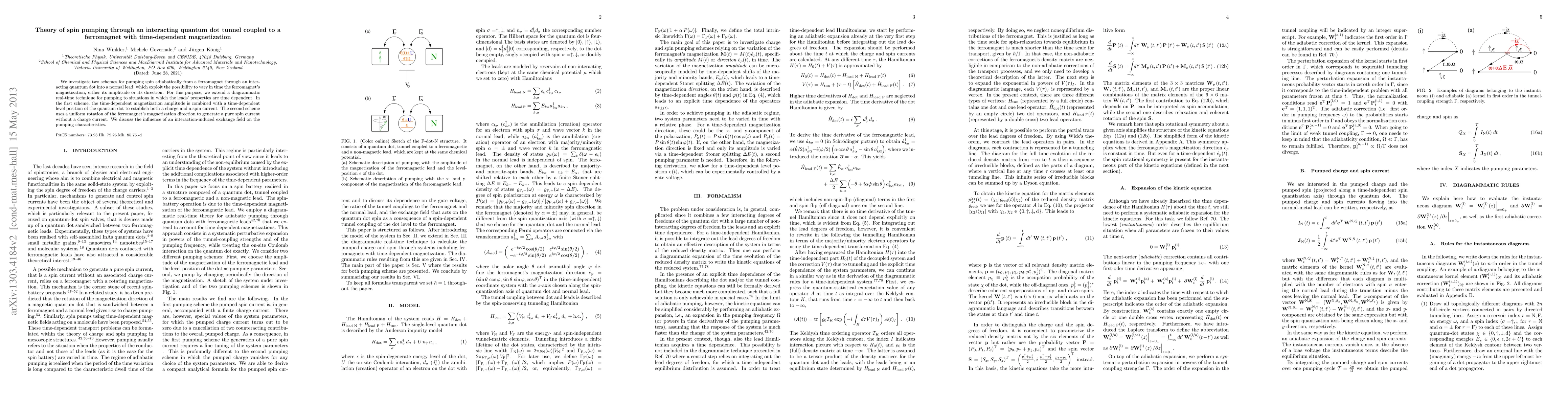 We investigate two schemes for pumping spin adiabatically from a ferromagnet through an interacting quantum dot into a normal lead, which exploit the possibility to vary in time the ferromagnet's magnetization, either its amplitude or its direction. For this purpose, we extend a diagrammatic real-time technique for pumping to situations in which the leads' properties are time dependent. In the first scheme, the time-dependent magnetization amplitude is combined with a time-dependent level position of the quantum dot to establish both a charge and a spin current. The second scheme uses a uniform rotation of the ferromagnet's magnetization direction to generate a pure spin current without a charge current. We discuss the influence of an interaction-induced exchange field on the pumping characteristics.