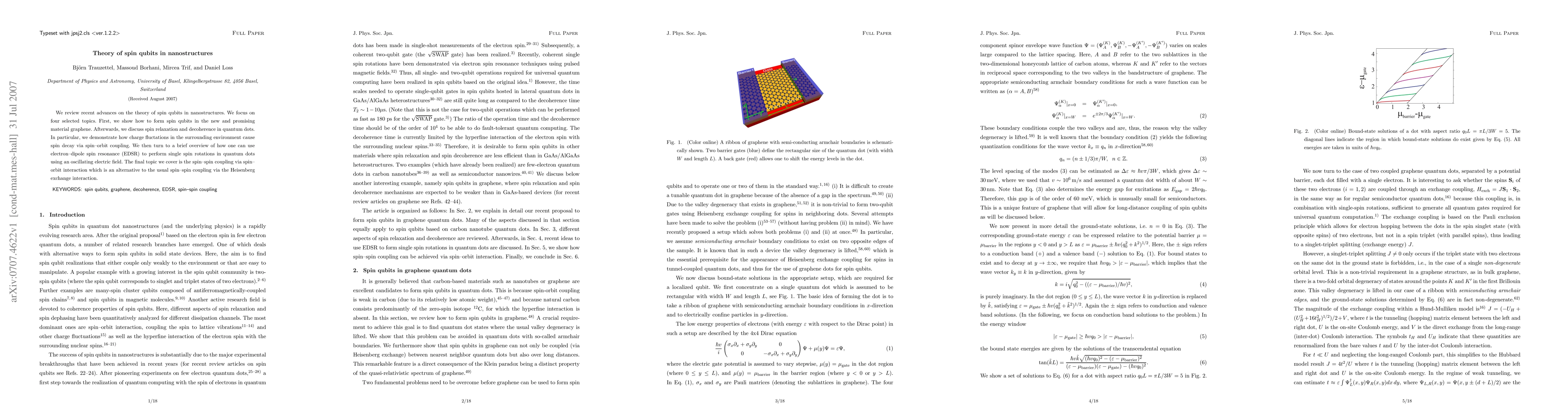 We review recent advances on the theory of spin qubits in nanostructures. We focus on four selected topics. First, we show how to form spin qubits in the new and promising material graphene. Afterwards, we discuss spin relaxation and decoherence in quantum dots. In particular, we demonstrate how charge fluctations in the surrounding environment cause spin decay via spin--orbit coupling. We then turn to a brief overview of how one can use electron-dipole spin resonance (EDSR) to perform single spin rotations in quantum dots using an oscillating electric field. The final topic we cover is the spin-spin coupling via spin-orbit interaction which is an alternative to the usual spin-spin coupling via the Heisenberg exchange interaction.