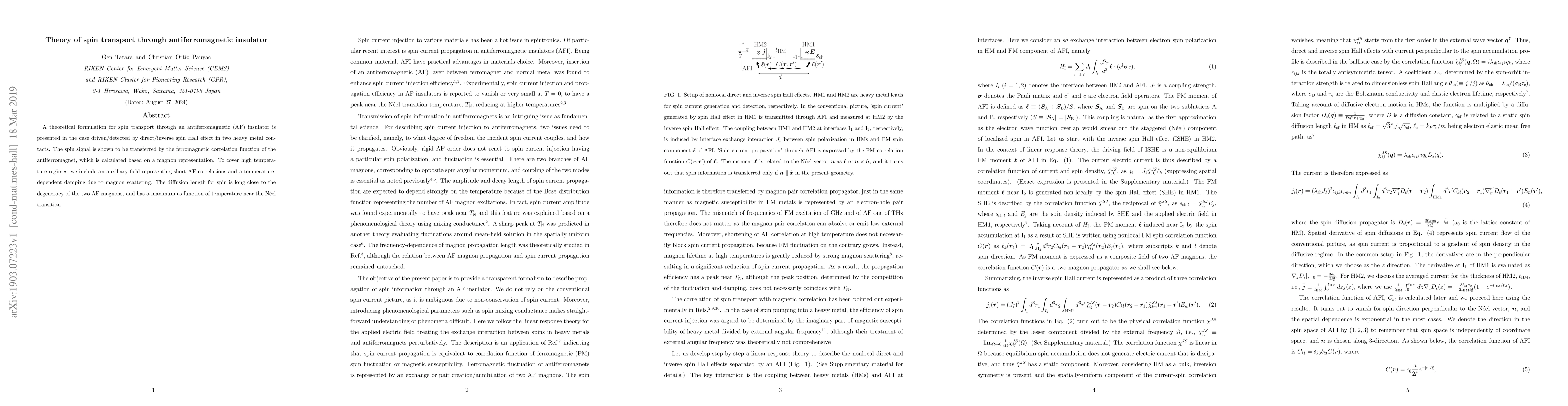 A theoretical formulation for spin transport through an antiferromagnetic (AF) insulator is presented in the case driven/detected by direct/inverse spin Hall effect in two heavy metal contacts. The spin signal is shown to be transferred by the ferromagnetic correlation function of the antiferromagnet, which is calculated based on a magnon representation. To cover high temperature regimes, we include an auxiliary field representing short AF correlations and a temperature-dependent damping due to magnon scattering. The diffusion length for spin is long close to the degeneracy of the two AF magnons, and has a maximum as function of temperature near the N\'eel transition.