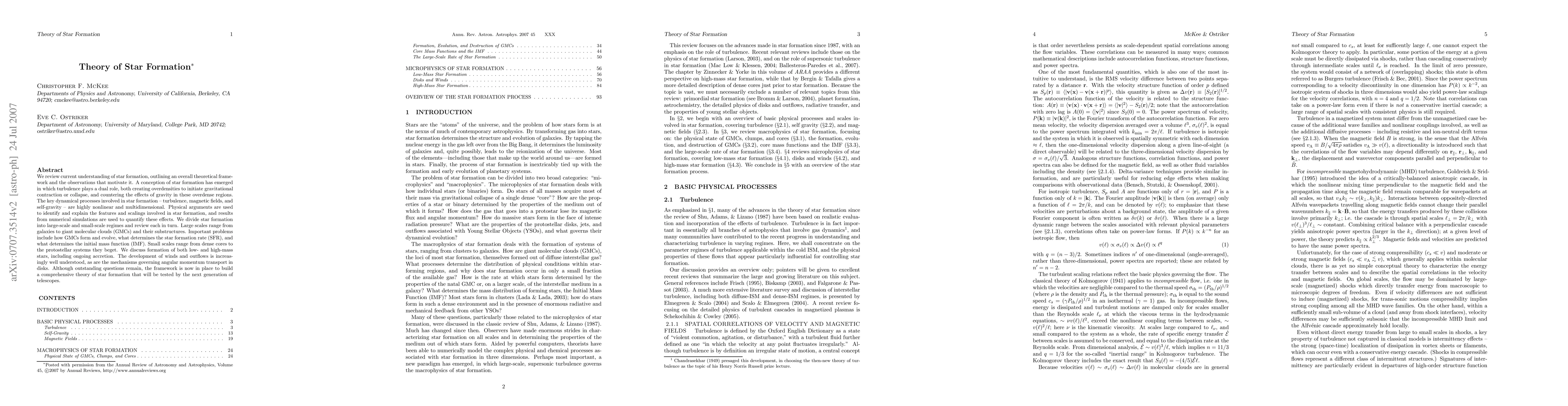 The paper reviews the current theory of star formation, highlighting turbulence's dual role in initiating collapse and countering gravity. It outlines key processes like turbulence, magnetic fields, and self-gravity, and divides star formation into large-scale (galaxy to GMC) and small-scale (core to protostar) regimes. The methodology combines physical arguments and numerical simulations, with ongoing research focusing on GMC formation, SFR determinants, IMF, low- and high-mass star formation, wind development, and angular momentum transport in disks.