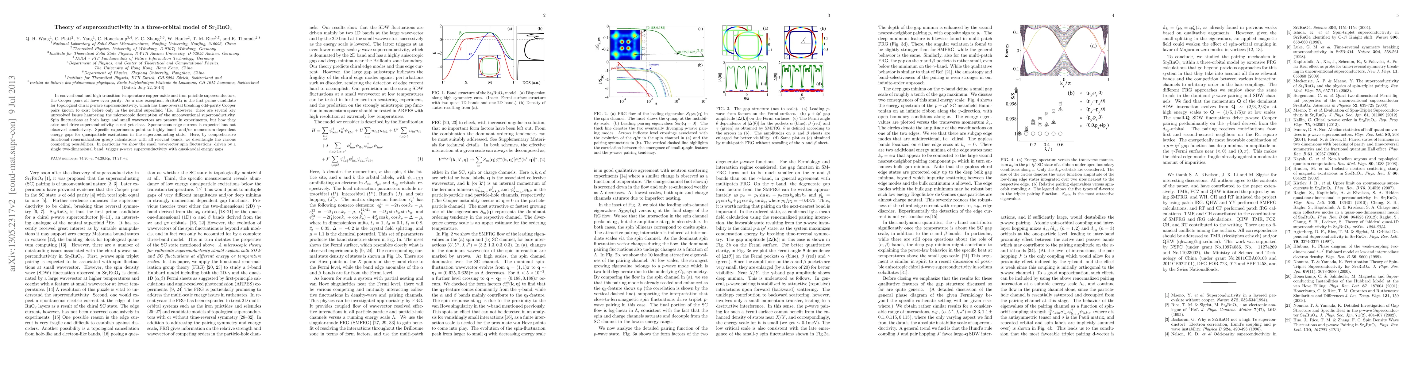In conventional and high transition temperature copper oxide and iron pnictide superconductors, the Cooper pairs all have even parity. As a rare exception, Sr$_2$RuO$_4$ is the first prime candidate for topological chiral p-wave superconductivity, which has time-reversal breaking odd-parity Cooper pairs known to exist before only in the neutral superfluid $^3$He. However, there are several key unresolved issues hampering the microscopic description of the unconventional superconductivity. Spin fluctuations at both large and small wavevectors are present in experiments, but how they arise and drive superconductivity is not yet clear. Spontaneous edge current is expected but not observed conclusively. Specific experiments point to highly band- and/or momentum-dependent energy gaps for quasiparticle excitations in the superconducting state. Here, by comprehensive functional renormalization group calculations with all relevant bands, we disentangle the various competing possibilities. In particular we show the small wavevector spin fluctuations, driven by a single two-dimensional band, trigger p-wave superconductivity with quasi-nodal energy gaps.