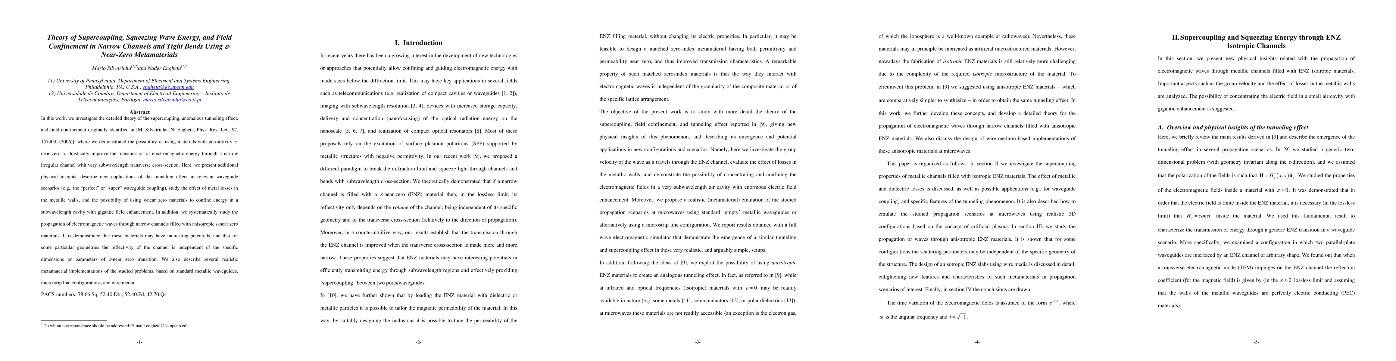 In this work, we investigate the detailed theory of the supercoupling, anomalous tunneling effect, and field confinement originally identified in [M. Silveirinha, N. Engheta, Phys. Rev. Lett. 97, 157403, (2006)], where we demonstrated the possibility of using materials with permittivity near zero to drastically improve the transmission of electromagnetic energy through a narrow irregular channel with very subwavelength transverse cross-section. Here, we present additional physical insights, describe new applications of the tunneling effect in relevant waveguide scenarios (e.g., the "perfect" or "super" waveguide coupling), study the effect of metal losses in the metallic walls, and the possibility of using epsilon-near zero materials to confine energy in a subwavelength cavity with gigantic field enhancement. In addition, we systematically study the propagation of electromagnetic waves through narrow channels filled with anisotropic epsilon-near zero materials. It is demonstrated that these materials may have interesting potentials, and that for some particular geometries the reflectivity of the channel is independent of the specific dimensions or parameters of epsilon-near zero transition. We also describe several realistic metamaterial implementations of the studied problems, based on standard metallic waveguides, microstrip line configurations, and wire media.