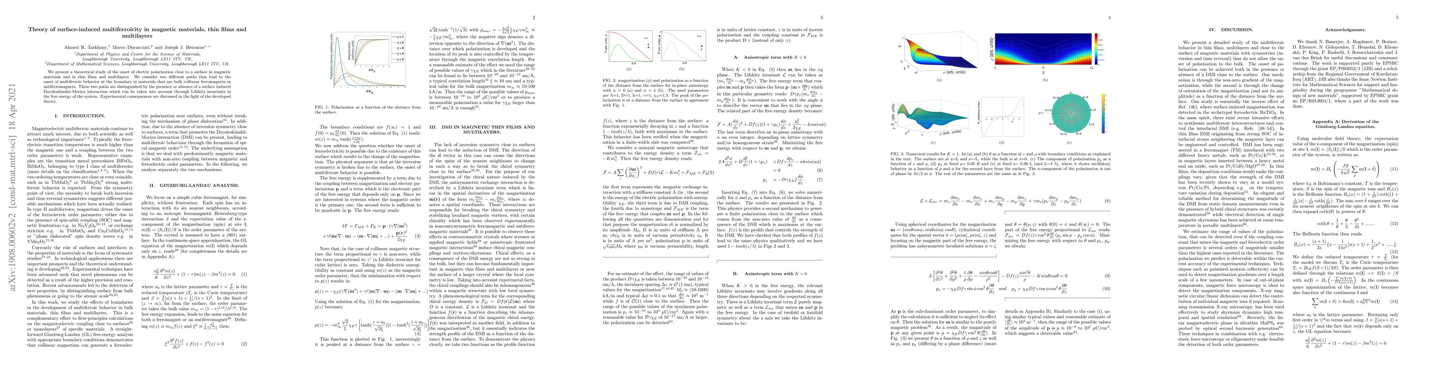 We present a theoretical study of the onset of electric polarization close to a surface in magnetic materials and in thin films and multilayers. We consider two different paths that lead to the onset of multiferroic behavior at the boundary in materials that are bulk collinear ferromagnets or antiferromagnets. These two paths are distinguished by the presence or absence of a surface induced Dzyaloshinskii-Moriya interaction which can be taken into account through Lifshitz invariants in the free energy of the system. Experimental consequences are discussed in the light of the developed theory.
