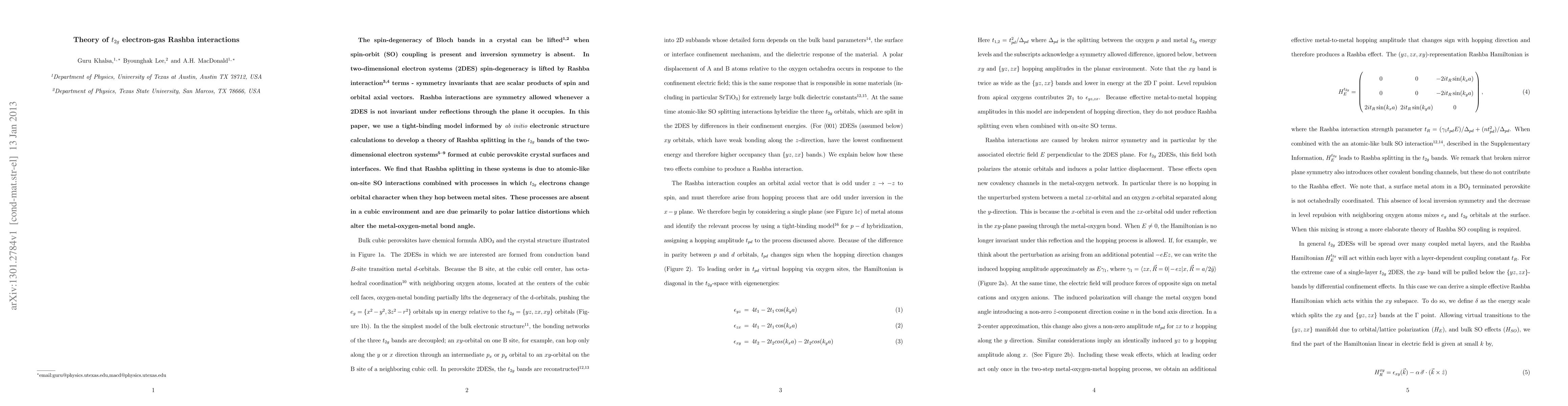 The spin-degeneracy of Bloch bands in a crystal can be lifted when spin-orbit (SO) coupling is present and inversion symmetry is absent. In two-dimensional electron systems (2DES) spin-degeneracy is lifted by Rashba interaction terms - symmetry invariants that are scalar products of spin and orbital axial vectors. Rashba interactions are symmetry allowed whenever a 2DES is not invariant under reflections through the plane it occupies. In this paper, we use a tight-binding model informed by ab initio electronic structure calculations to develop a theory of Rashba splitting in the t2g bands of the two- dimensional electron systems formed at cubic perovskite crystal surfaces and interfaces. We find that Rashba splitting in these systems is due to atomic-like on-site SO interactions combined with processes in which t2g electrons change orbital character when they hop between metal sites. These processes are absent in a cubic environment and are due primarily to polar lattice distortions which alter the metal-oxygen-metal bond angle.