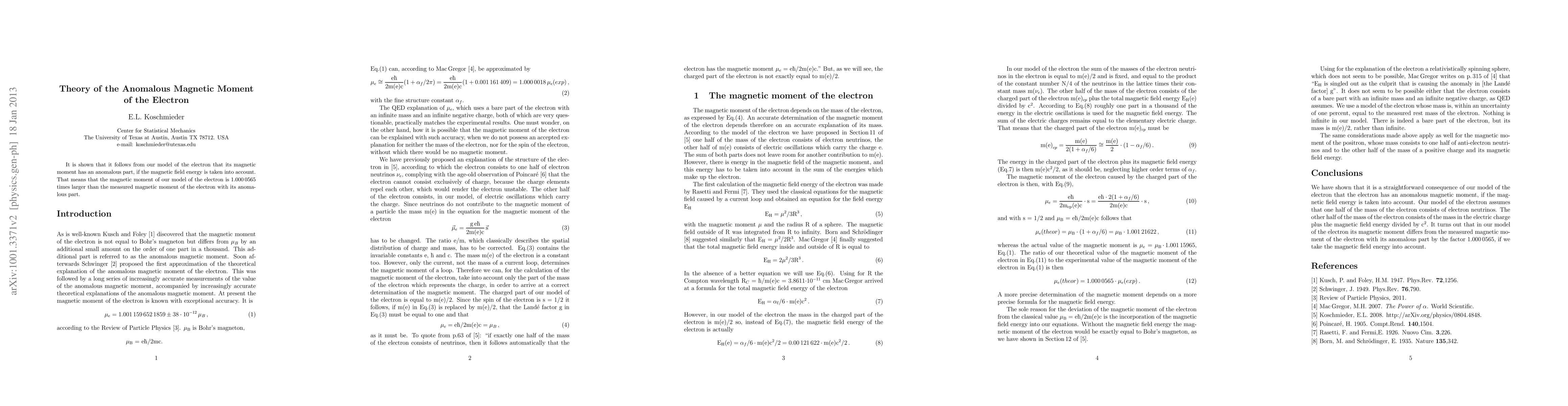 It is shown that it follows from our model of the electron that its magnetic moment has an anomalous part if the magnetic field energy is taken into account. That means that the magnetic moment of our model of the electron is 1.0000565 times larger than the measured magnetic moment of the electron.