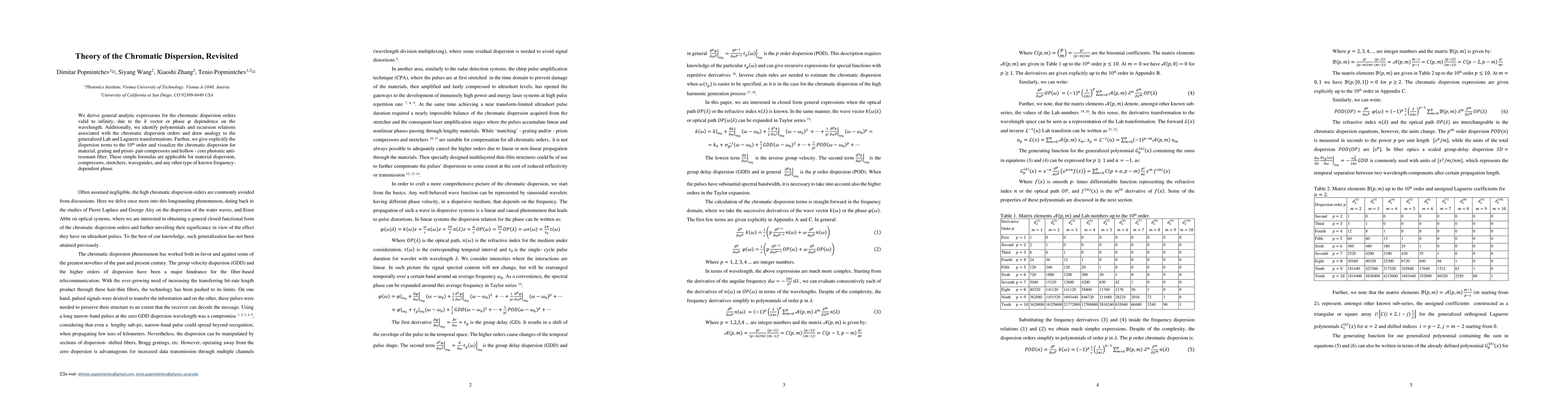 The paper presents analytical expressions for chromatic dispersion orders up to infinity, applicable to various optical components like materials, gratings, and fibers. It also introduces polynomials and recursion relations akin to Lah and Laguerre transformations, providing explicit dispersion terms up to the 10th order for visualization.