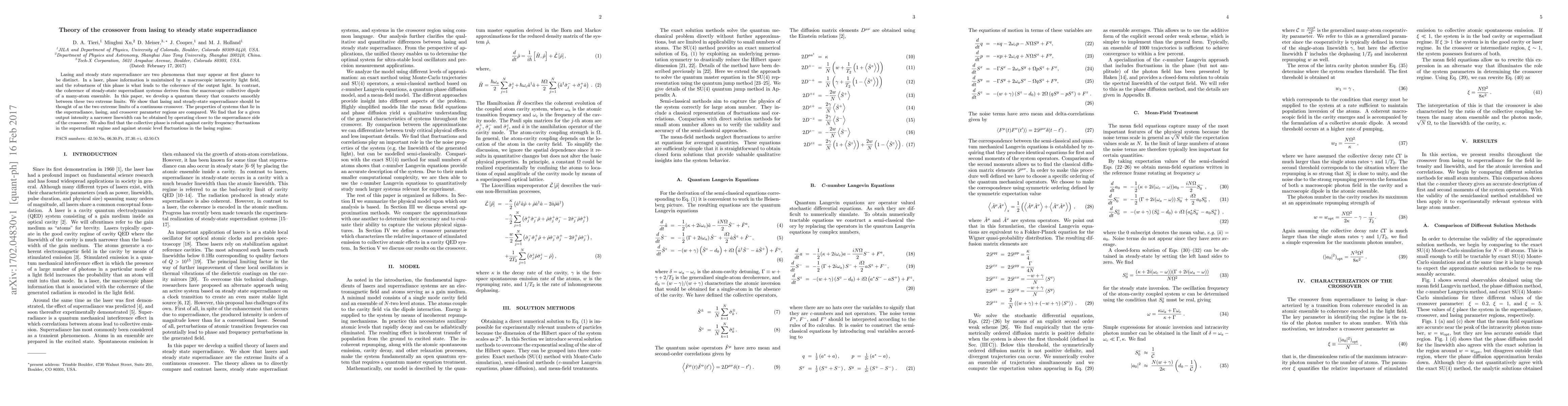 Lasing and steady state superradiance are two phenomena that may appear at first glance to be distinct. In a laser, phase information is maintained by a macroscopic intracavity light field, and the robustness of this phase is what leads to the coherence of the output light. In contrast, the coherence of steady-state superradiant systems derives from the macroscopic collective dipole of a many-atom ensemble. In this paper, we develop a quantum theory that connects smoothly between these two extreme limits. We show that lasing and steady-state superradiance should be thought of as the two extreme limits of a continuous crossover. The properties of systems that lie in the superradiance, lasing, and crossover parameter regions are compared. We find that for a given output intensity a narrower linewidth can be obtained by operating closer to the superradiance side of the crossover. We also find that the collective phase is robust against cavity frequency fluctuations in the superradiant regime and against atomic level fluctuations in the lasing regime.