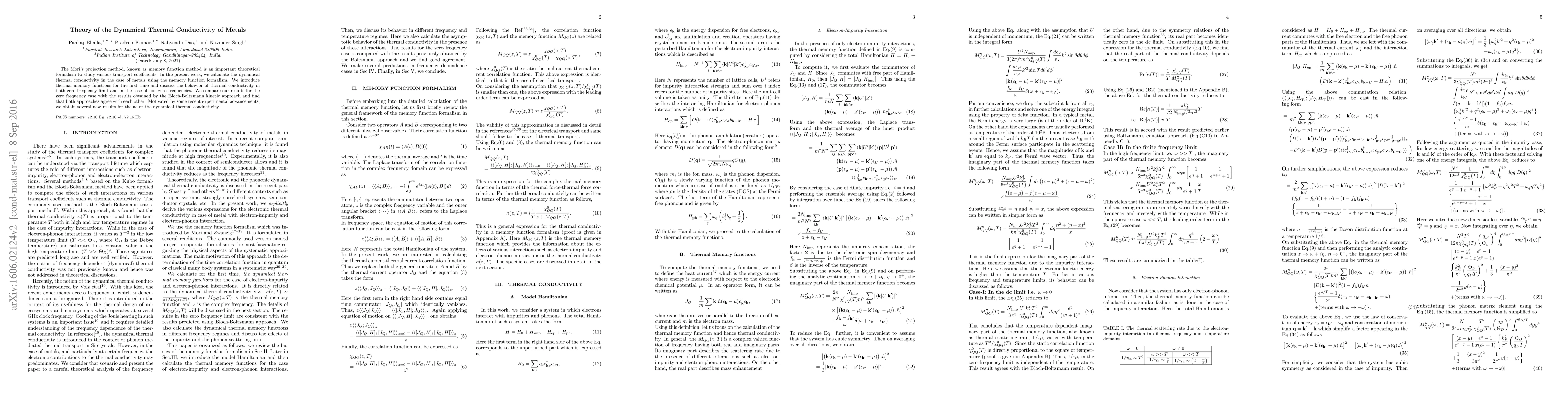 The Mori's projection method, known as memory function method is an important theoretical formalism to study various transport coefficients. In the present work, we calculate the dynamical thermal conductivity in the case of metals using the memory function formalism. We introduce thermal memory functions for the first time and discuss the behavior of thermal conductivity in both zero frequency limit and in the case of non-zero frequencies. We compare our results for the zero frequency case with the results obtained by the Bloch-Boltzmann kinetic approach and find that both approaches agree with each other. Motivated by some recent experimental advancements, we obtain several new results for the ac or the dynamical thermal conductivity.