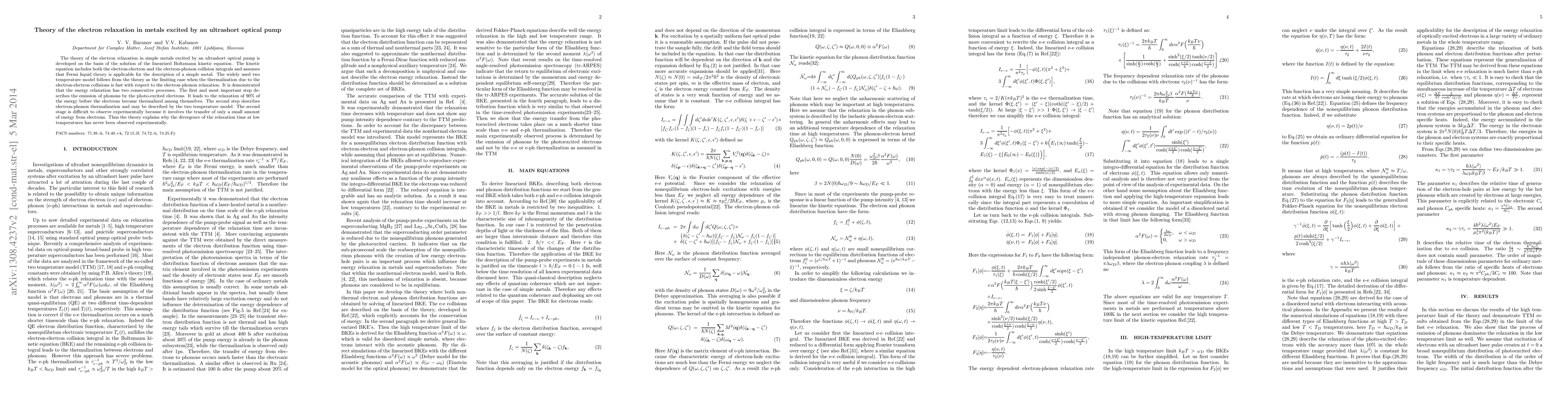 This paper develops a theory for electron relaxation in metals excited by ultrashort optical pulses, showing that energy relaxation occurs in two stages: first, phonon emission by photo-excited electrons, and second, electron-phonon thermalization. The two-temperature model emerges as a limiting case when electron-electron thermalization is rapid.