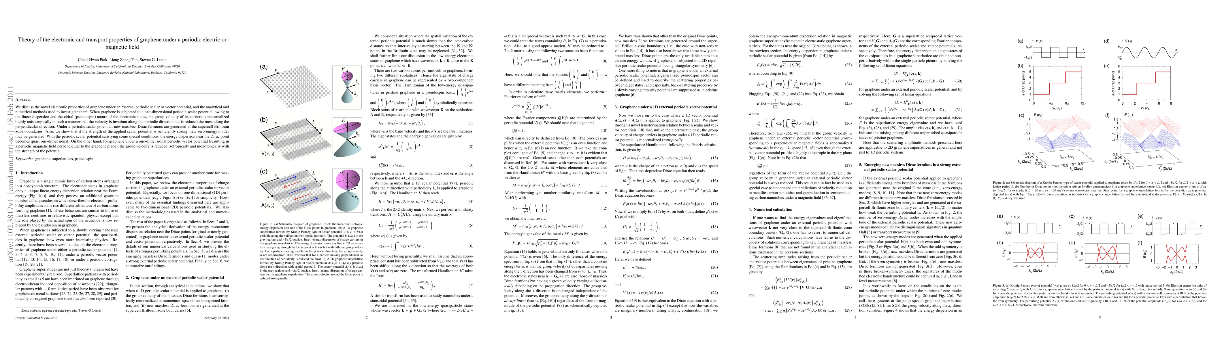 This paper explores the electronic and transport properties of graphene under periodic electric or magnetic fields, revealing anisotropic renormalization of carrier velocities and the generation of new massless Dirac fermions and zero-energy modes under specific conditions. The study also shows that a periodic vector potential reduces group velocity isotropically.