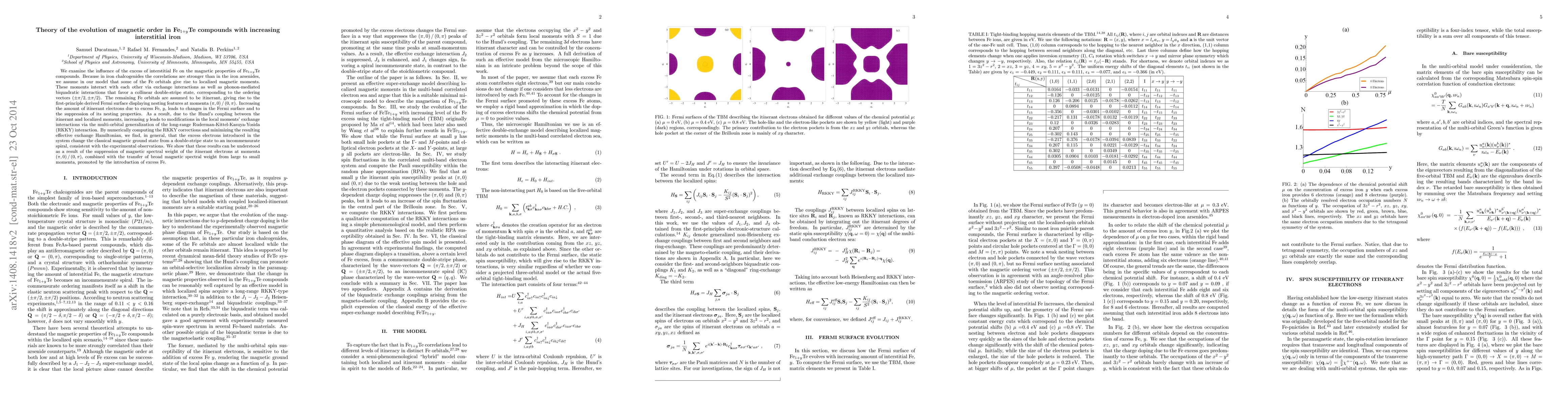 We examine the influence of the excess of interstitial Fe on the magnetic properties of Fe$_{1+y}$Te compounds. Because in iron chalcogenides the correlations are stronger than in the iron arsenides, we assume in our model that some of the Fe orbitals give rise to localized magnetic moments. These moments interact with each other via exchange interactions as well as phonon-mediated biquadratic interactions that favor a collinear double-stripe state, corresponding to the ordering vectors $\left(\pm\pi/2,\pm\pi/2\right)$. The remaining Fe orbitals are assumed to be itinerant, giving rise to the first-principle derived Fermi surface displaying nesting features at momenta $\left(\pi,0\right)/\left(0,\pi\right)$. Increasing the amount of itinerant electrons due to excess Fe, $y$, leads to changes in the Fermi surface and to the suppression of its nesting properties. As a result, due to the Hund's coupling between the itinerant and localized moments, increasing $y$ leads to modifications in the local moments' exchange interactions via the multi-orbital generalization of the long-range Ruderman-Kittel-Kasuya-Yosida (RKKY) interaction. By numerically computing the RKKY corrections and minimizing the resulting effective exchange Hamiltonian, we find, in general, that the excess electrons introduced in the system change the classical magnetic ground state from a double-stripe state to an incommensurate spiral, consistent with the experimental observations. We show that these results can be understood as a result of the suppression of magnetic spectral weight of the itinerant electrons at momenta $\left(\pi,0\right)/\left(0,\pi\right)$, combined with the transfer of broad magnetic spectral weight from large to small momenta, promoted by the introduction of excess Fe.