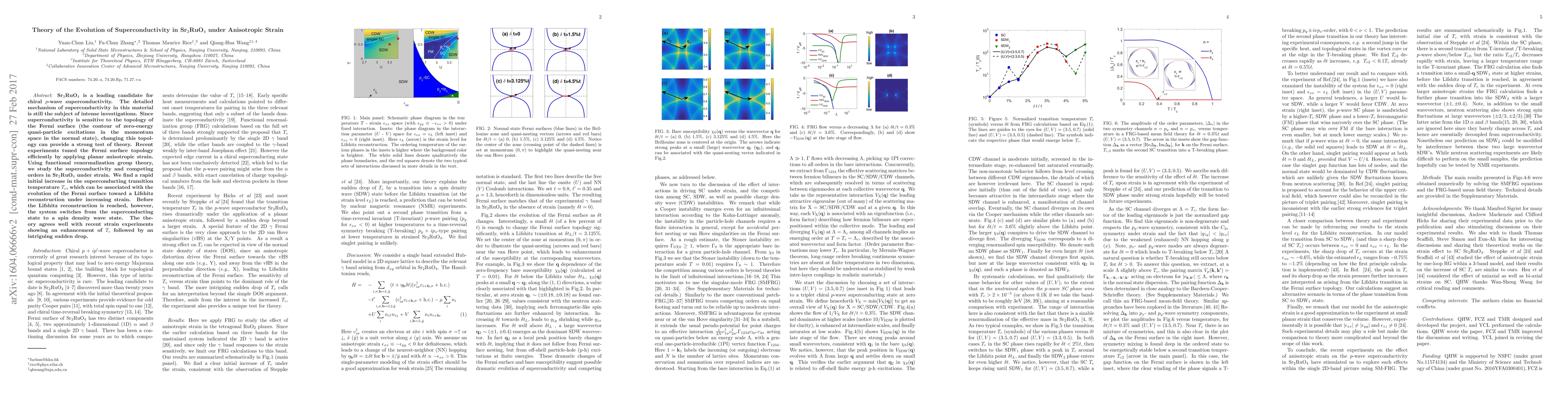 This paper investigates the evolution of superconductivity in Sr$_2$RuO$_4$ under anisotropic strain using functional renormalization group theory, finding a rise in the superconducting transition temperature $T_c$ linked to Fermi surface changes, followed by a transition to a spin density wave state. The theory aligns with experimental observations of $T_c$ enhancement and subsequent drop.