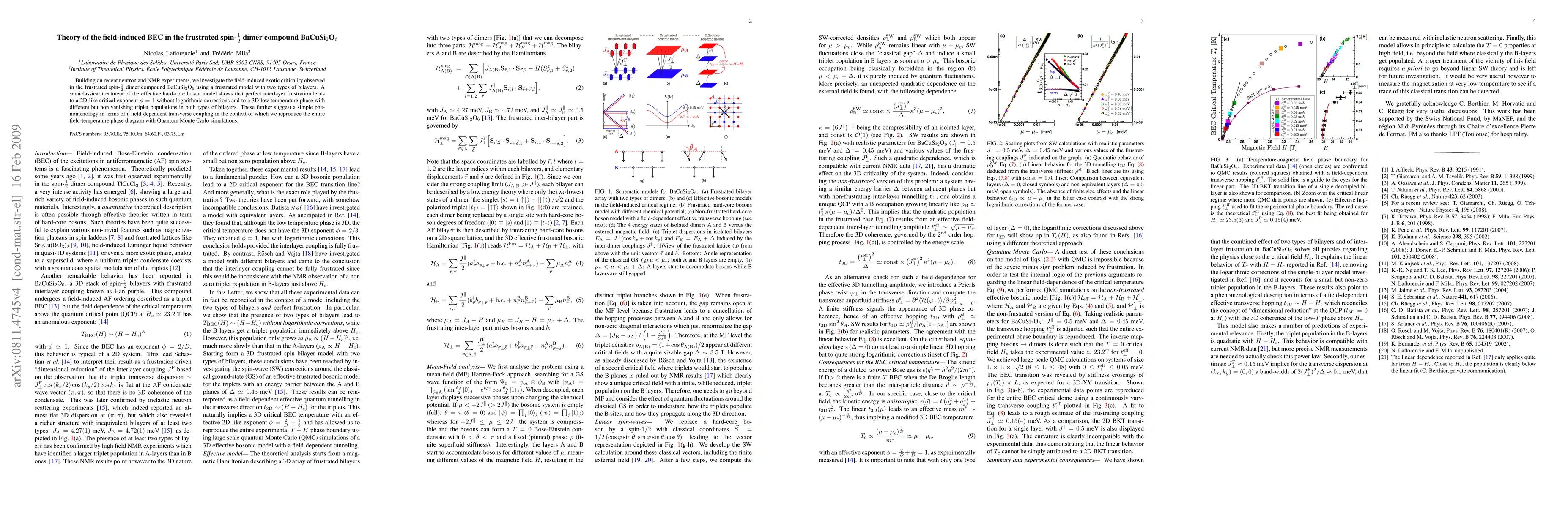 This paper explores the field-induced behavior in the frustrated spin-1/2 dimer compound BaCuSi2O6, revealing a unique criticality through neutron and NMR experiments. The study employs a semiclassical model to demonstrate a 2D-like critical exponent and a 3D low-temperature phase, suggesting a field-dependent transverse coupling that accurately reproduces the field-temperature phase diagram via Quantum Monte Carlo simulations.