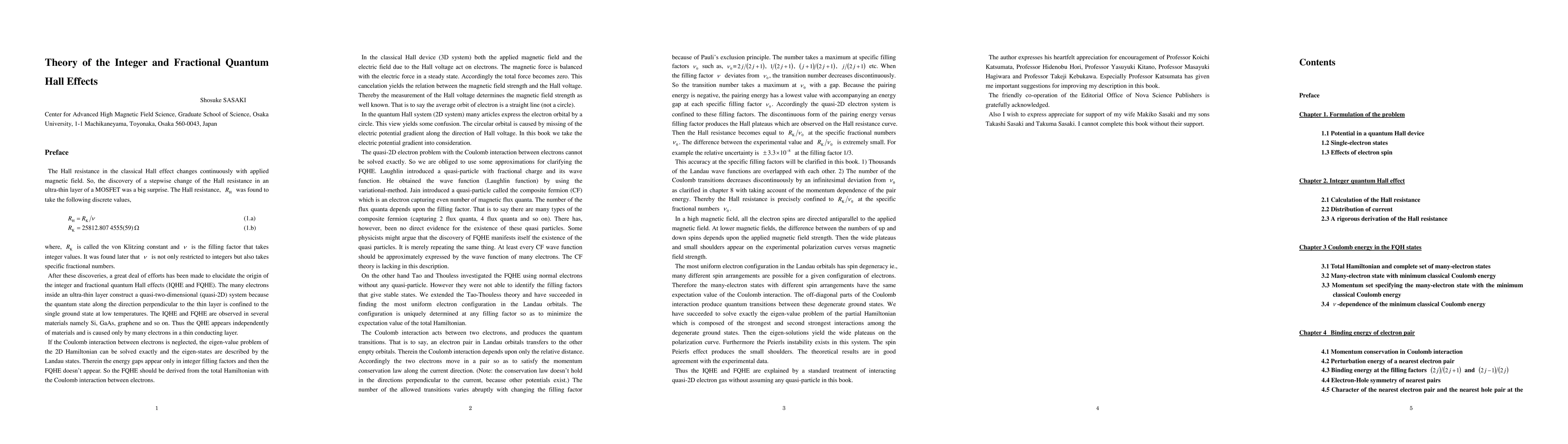 The present theory has investigated the FQHE without any quasi-particle. The electric field due to the Hall voltage is taken into consideration. We find the ground state where the electron configuration is uniquely determined so as to have the minimum classical Coulomb energy. Residual Coulomb interaction HI yields quantum transitions which satisfy the momentum conservation along the current direction. The number of Coulomb transitions from nearest electron pairs is dependent sensitively upon the fractional number of the filling factor. For example, the number u(2/3) of allowed transitions at nu=2/3 abruptly decreases when the filling factor nu deviates slightly from 2/3. The limiting value of the number is equal to half of u(2/3). The discontinuous behavior produces the valley structure in the energy spectrum. This mechanism produces the Hall plateaus at the specific filling factors nu=1/(2j+1), 2j /(2j+1), j/(2j+1), j/(2j-1) etc. and also at the non-standard filling factors nu=7/11, 4/11, 4/13, 5/13, 5/17, 6/17 etc. We have studied the pair energies of more distant electron pairs in Chapter 5. Thereby the small valley structure yields at nu=5/2, 7/2 and so on. The shapes of polarization curves depend mainly upon the numerator of the fractional filling factor in nu<1 because the spin polarization belongs to electrons only. There are many spin-arrangements with the same eigen-energy of HD. The Coulomb interaction HI yields quantum transitions among these degenerate ground states. The partial Hamiltonian has been diagonalized exactly. The eigen-states give the spin polarization versus magnetic field strength. The theoretical curves of the spin polarization are in good agreement with the experimental data as studied in Chapter 9. Thus the present theory has well explained the various phenomena of the FQHE.