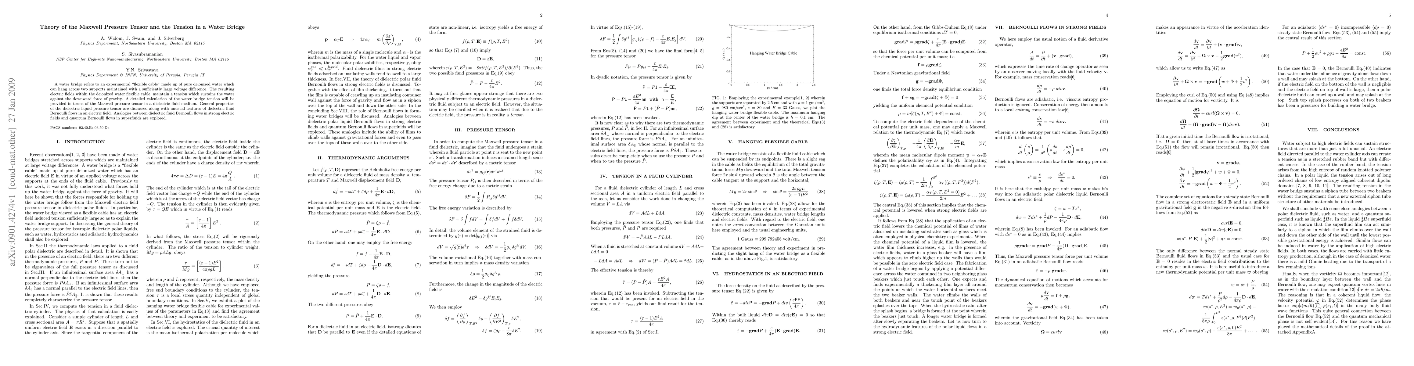 This paper investigates the tension in a water bridge, a flexible cable of deionized water held by electric fields, using the Maxwell pressure tensor to calculate the tension. It explores the properties of the dielectric fluid pressure tensor and compares dielectric fluid Bernoulli flows in electric fields to quantum Bernoulli flows in superfluids.