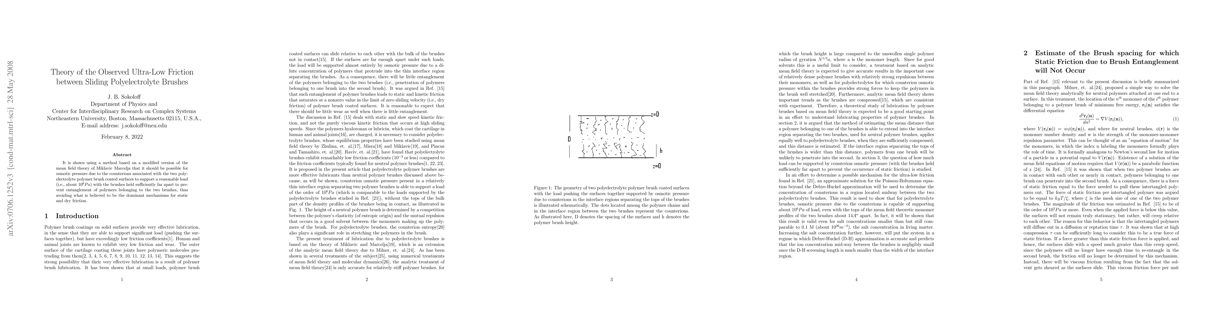It is shown using a method based on a modified version of the mean field theory of Miklavic Marcelja that it should be possible for osmotic pressure due to the counterions associated with the two polyelectrolyte polymer brush coated surfaces to support a reasonable load (i.e., about $10^6 Pa$) with the brushes held sufficiently far apart to prevent entanglement of polymers belonging to the two brushes, thus avoiding what is believed to be the dominant mechanisms for static and dry friction.