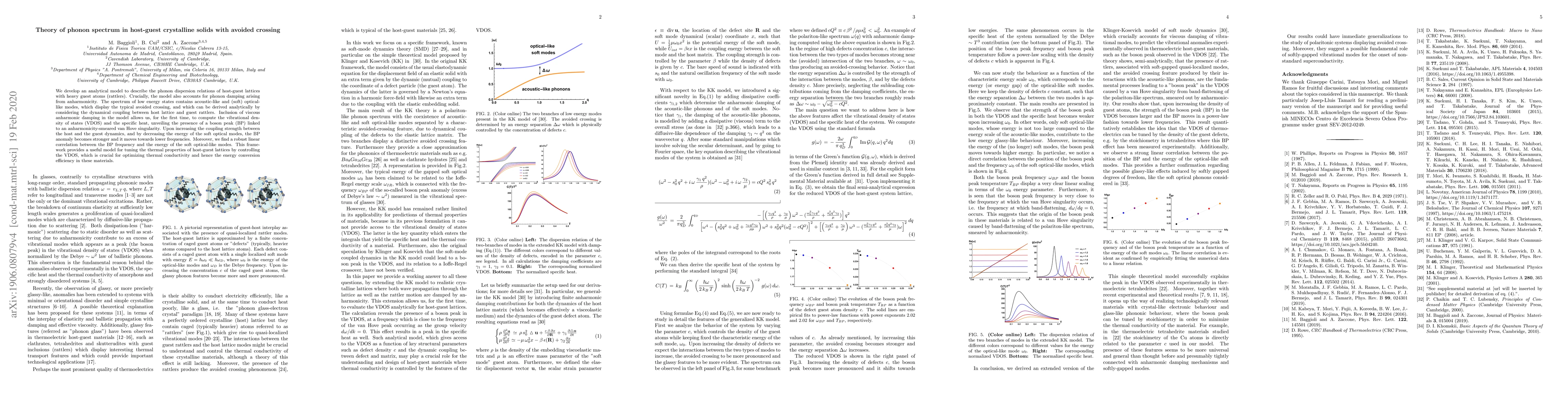 This paper develops an analytical model to describe phonon dispersion in host-guest crystalline solids, focusing on the phonon spectrum and damping effects due to anharmonicity. The model reveals a boson peak linked to an anharmonicity-smeared van Hove singularity, and shows how the peak's strength and frequency correlate with the energy of soft optical modes, offering insights into tuning thermal properties for better energy conversion efficiency.