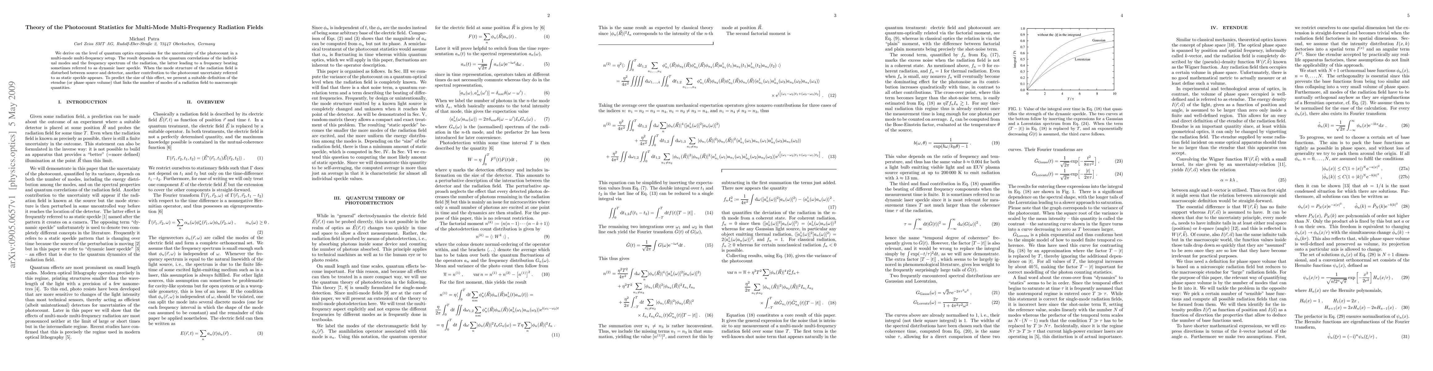 We derive on the level of quantum optics expressions for the uncertainty of the photocount in a multi-mode multi-frequency setup. The result depends on the quantum correlations of the individual modes and the frequency spectrum of the radiation, the latter leading to a frequency beating sometimes referred to as dynamic laser speckle. When the mode structure of the radiation field is disturbed between source and detector, another contribution to the photocount uncertainty referred to as static speckle appears. To predict the size of this effect, we present a suitable definition of the etendue (or phase space volume) that links the number of modes of a radiation field to macroscopic quantities.