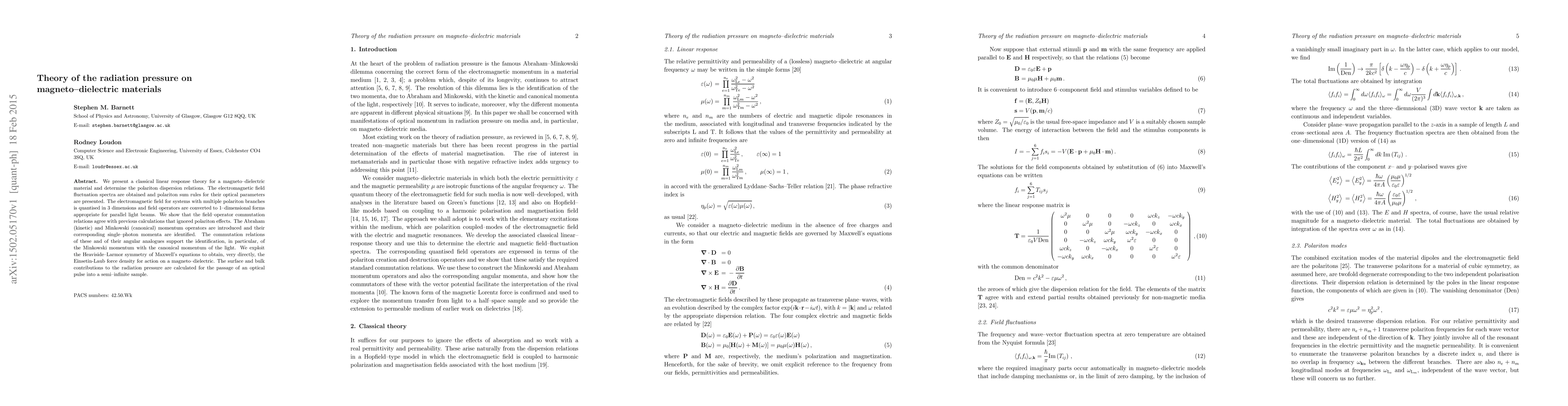 We present a classical linear response theory for a magneto-dielectric material and determine the polariton dispersion relations. The electromagnetic field fluctuation spectra are obtained and polariton sum rules for their optical parameters are presented. The electromagnetic field for systems with multiple polariton branches is quantised in 3 dimensions and field operators are converted to 1-dimensional forms appropriate for parallel light beams. We show that the field-operator commutation relations agree with previous calculations that ignored polariton effects. The Abraham (kinetic) and Minkowski (canonical) momentum operators are introduced and their corresponding single-photon momenta are identified. The commutation relations of these and of their angular analogues support the identification, in particular, of the Minkowski momentum with the canonical momentum of the light. We exploit the Heaviside-Larmor symmetry of Maxwell's equations to obtain, very directly, the Einsetin-Laub force density for action on a magneto-dielectric. The surface and bulk contributions to the radiation pressure are calculated for the passage of an optical pulse into a semi-infinite sample.