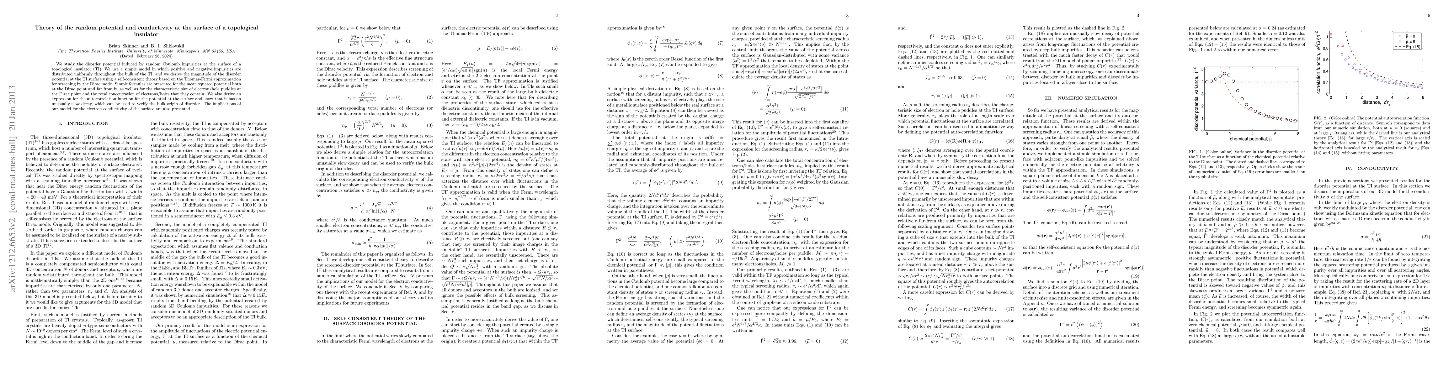 This research derives formulas for disorder potential magnitude at the surface of topological insulators (TI) caused by random Coulomb impurities in the bulk. Using a self-consistent theory and Thomas-Fermi approximation, it calculates mean squared potential, puddle size, and electron/hole concentration. The study also reveals an unusually slow decay in the potential autocorrelation function, indicating bulk disorder origin, with implications for surface electron conductivity.