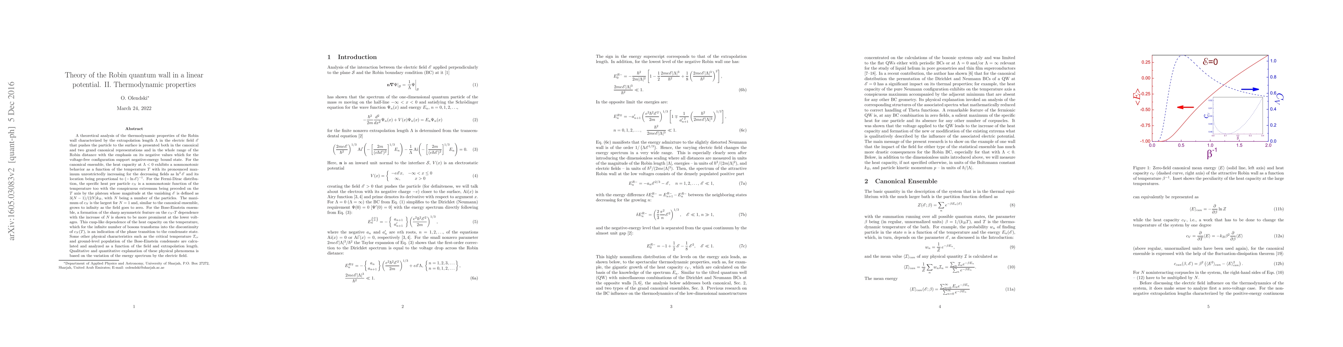 A theoretical analysis of the thermodynamic properties of the Robin wall characterized by the extrapolation length $\Lambda$ in the electric field $\mathscr{E}$ that pushes the particle to the surface is presented both in the canonical and two grand canonical representations and in the whole range of the Robin distance with the emphasis on its negative values which for the voltage-free configuration support negative-energy bound state. For the canonical ensemble, the heat capacity at $\Lambda<0$ exhibits a nonmonotonic behavior as a function of the temperature $T$ with its pronounced maximum unrestrictedly increasing for the decreasing fields as $\ln^2\mathscr{E}$ and its location being proportional to $(-\ln\mathscr{E})^{-1}$. For the Fermi-Dirac distribution, the specific heat per particle $c_N$ is a nonmonotonic function of the temperature too with the conspicuous extremum being preceded on the $T$ axis by the plateau whose magnitude at the vanishing $\mathscr{E}$ is defined as $3(N-1)/(2N)k_B$, with $N$ being a number of the particles. The maximum of $c_N$ is the largest for $N=1$ and, similar to the canonical ensemble, grows to infinity as the field goes to zero. For the Bose-Einstein ensemble, a formation of the sharp asymmetric feature on the $c_N$-$T$ dependence with the increase of $N$ is shown to be more prominent at the lower voltages. This cusp-like dependence of the heat capacity on the temperature, which for the infinite number of bosons transforms into the discontinuity of $c_N(T)$, is an indication of the phase transition to the condensate state. Qualitative and quantitative explanation of these physical phenomena is based on the variation of the energy spectrum by the electric field.