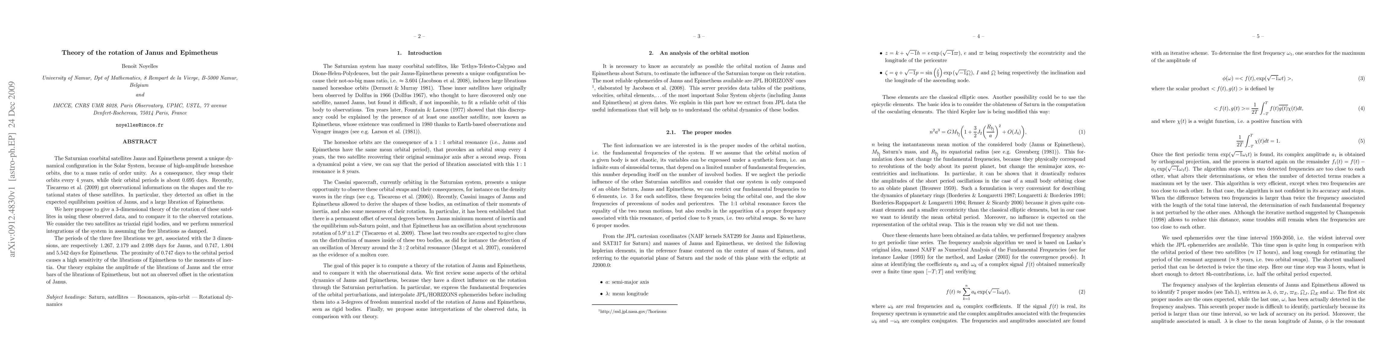 This paper proposes a 3-dimensional theory to explain the rotation of Saturnian coorbital satellites Janus and Epimetheus, using observational data on their shapes and rotational states. The theory models the satellites as triaxial rigid bodies and predicts specific libration periods, explaining the observed amplitudes of Janus's librations and the error bars of Epimetheus's librations, though it does not account for an observed offset in Janus's orientation.
