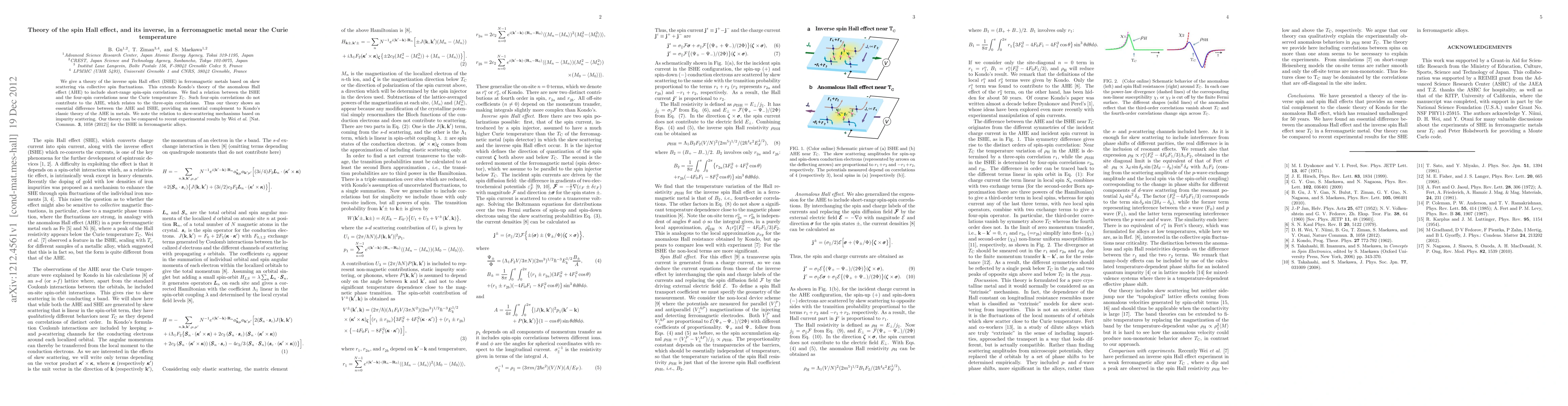 We give a theory of the inverse spin Hall effect (ISHE) in ferromagnetic metals based on skew scattering via collective spin fluctuations. This extends Kondo's theory of the anomalous Hall effect (AHE) to include short-range spin-spin correlations. We find a relation between the ISHE and the four-spin correlations near the Curie temperature TC. Such four-spin correlations do not contribute to the AHE, which relates to the three-spin correlations. Thus our theory shows an essential difference between the AHE and ISHE, providing an essential complement to Kondo's classic theory of the AHE in metals. We note the relation to skew-scattering mechanisms based on impurity scattering. Our theory can be compared to recent experimental results byWei et al. [Nat. Commun. 3, 1058 (2012)] for the ISHE in ferromagnetic alloys.