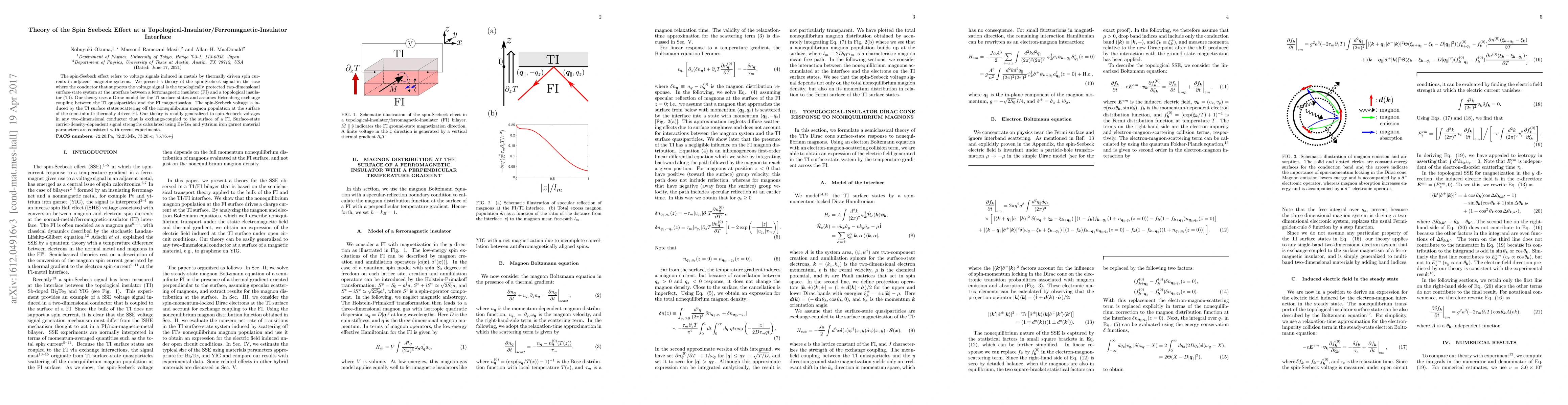 The spin-Seebeck effect refers to voltage signals induced in metals by thermally driven spin currents in adjacent magnetic systems. We present a theory of the spin-Seebeck signal in the case where the conductor that supports the voltage signal is the topologically protected two-dimensional surface-state system at the interface between a ferromagnetic insulator (FI) and a topological insulator (TI). Our theory uses a Dirac model for the TI surface-states and assumes Heisenberg exchange coupling between the TI quasiparticles and the FI magnetization. The spin-Seebeck voltage is induced by the TI surface states scattering off the nonequilibrium magnon population at the surface of the semi-infinite thermally driven FI. Our theory is readily generalized to spin-Seebeck voltages in any two-dimensional conductor that is exchange-coupled to the surface of a FI. Surface-state carrier-density-dependent signal strengths calculated using Bi$_2$Te$_3$ and yttrium iron garnet material parameters are consistent with recent experiments.