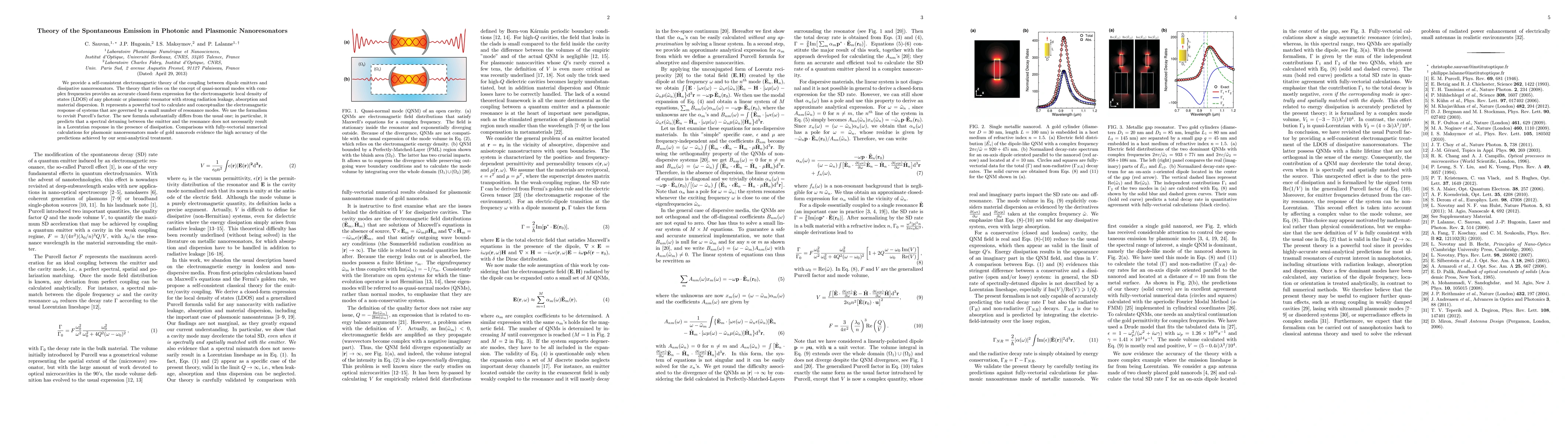 We provide a self-consistent electromagnetic theory of the coupling between dipole emitters and dissipative nanoresonators. The theory that relies on the concept of quasi-normal modes with complex frequencies provides an accurate closed-form expression for the electromagnetic local density of states (LDOS) of any photonic or plasmonic resonator with strong radiation leakage, absorption and material dispersion. It represents a powerful tool to calculate and conceptualize the electromagnetic response of systems that are governed by a small number of resonance modes. We use the formalism to revisit Purcell's factor. The new formula substantially differs from the usual one; in particular, it predicts that a spectral detuning between the emitter and the resonance does not necessarily result in a Lorentzian response in the presence of dissipation. Comparisons with fully-vectorial numerical calculations for plasmonic nanoresonators made of gold nanorods evidence the high accuracy of the predictions achieved by our semi-analytical treatment.