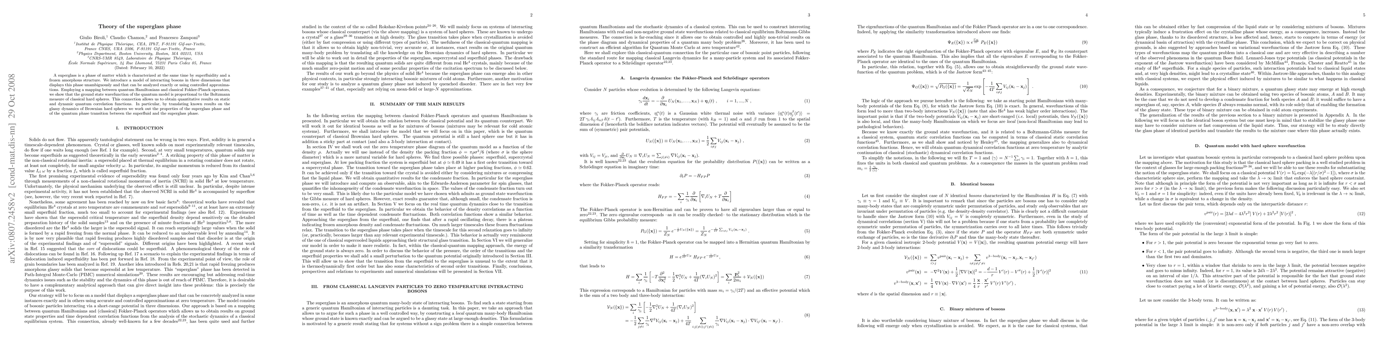 This paper introduces a model of interacting bosons that exhibits a superglass phase, characterized by superfluidity and a frozen amorphous structure. The authors use a mapping between quantum Hamiltonians and classical Fokker-Planck operators to analyze the quantum model, revealing quantitative results on quantum correlation functions and detailing the properties of the superglass phase and the quantum phase transition from superfluidity.