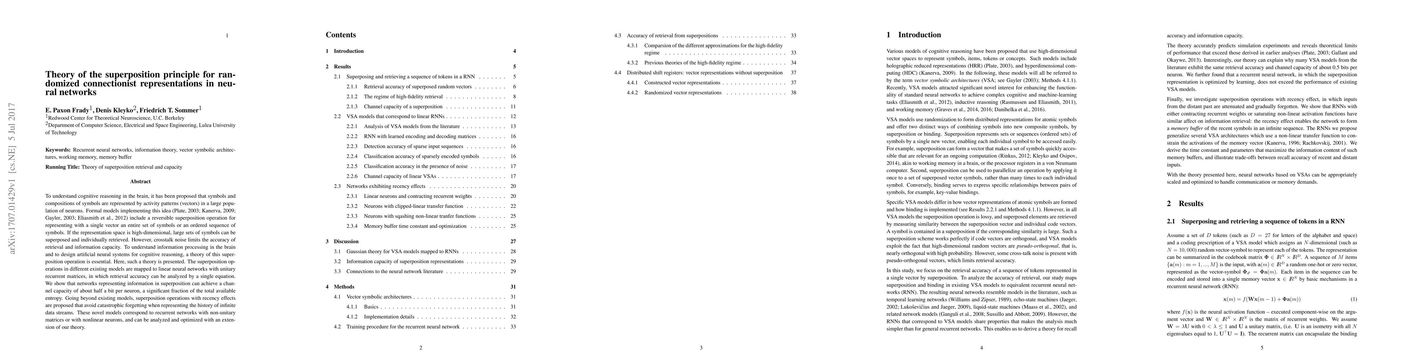 To understand cognitive reasoning in the brain, it has been proposed that symbols and compositions of symbols are represented by activity patterns (vectors) in a large population of neurons. Formal models implementing this idea [Plate 2003], [Kanerva 2009], [Gayler 2003], [Eliasmith 2012] include a reversible superposition operation for representing with a single vector an entire set of symbols or an ordered sequence of symbols. If the representation space is high-dimensional, large sets of symbols can be superposed and individually retrieved. However, crosstalk noise limits the accuracy of retrieval and information capacity. To understand information processing in the brain and to design artificial neural systems for cognitive reasoning, a theory of this superposition operation is essential. Here, such a theory is presented. The superposition operations in different existing models are mapped to linear neural networks with unitary recurrent matrices, in which retrieval accuracy can be analyzed by a single equation. We show that networks representing information in superposition can achieve a channel capacity of about half a bit per neuron, a significant fraction of the total available entropy. Going beyond existing models, superposition operations with recency effects are proposed that avoid catastrophic forgetting when representing the history of infinite data streams. These novel models correspond to recurrent networks with non-unitary matrices or with nonlinear neurons, and can be analyzed and optimized with an extension of our theory.