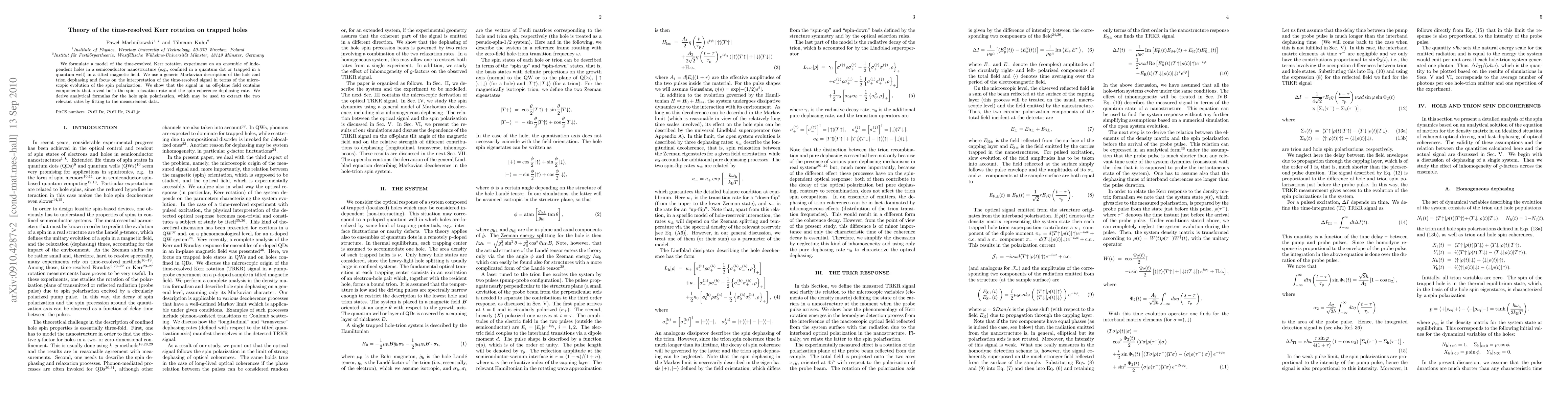 We formulate a model of the time-resolved Kerr rotation experiment on a single hole in a semiconductor nanostructure (e.g., a quantum dot) or on an ensemble of trapped holes (e.g., in a quantum well) in a tilted magnetic field. We use a generic Markovian description of the hole and trion dephasing and focus on the interpretation of the time-resolved signal in terms of the microscopic evolution of the spin polarization. We show that the signal in an off-plane field contains components that reveal both the spin relaxation rate and the spin coherence dephasing rate. We derive analytical formulas for the hole spin polarization, which may be used to extract the two relevant rates by fitting to the measurement data.