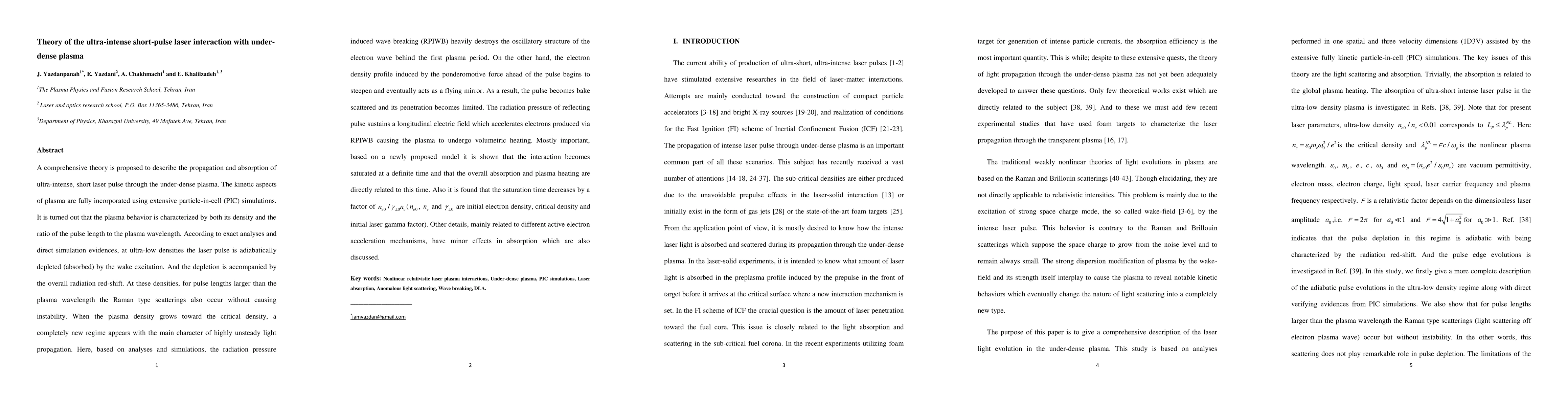 A comprehensive theory is proposed to describe the propagation and absorption of ultra-intense, short laser pulse through the under-dense plasma. The kinetic aspects of plasma are fully incorporated using extensive particle-in-cell (PIC) simulations. It is turned out that the plasma behavior is characterized by both its density and the ratio of the pulse length to the plasma wavelength. According to exact analyses and direct simulation evidences, at ultra-low densities the laser pulse is adiabatically depleted (absorbed) by the wake excitation. And the depletion is accompanied by the overall radiation red-shift. At these densities, for pulse lengths larger than the plasma wavelength the Raman type scatterings also occur without causing instability. When the plasma density grows toward the critical density, a completely new regime appears with the main character of highly unsteady light propagation. Here, based on analyses and simulations, the radiation pressure induced wave breaking (RPIWB) heavily destroys the oscillatory structure of the electron wave behind the first plasma period. On the other hand, the electron density profile induced by the ponderomotive force ahead of the pulse begins to steepen and eventually acts as a flying mirror. As a result, the pulse becomes bake scattered and its penetration becomes limited. The radiation pressure of reflecting pulse sustains a longitudinal electric field which accelerates electrons produced via RPIWB causing the plasma to undergo volumetric heating. Mostly important, based on a newly proposed model it is shown that the interaction becomes saturated at a definite time and that the overall absorption and plasma heating are directly related to this time. Also it is found that the saturation time decreases by a factor of ( , and are initial electron density, critical density and initial laser gamma factor)...