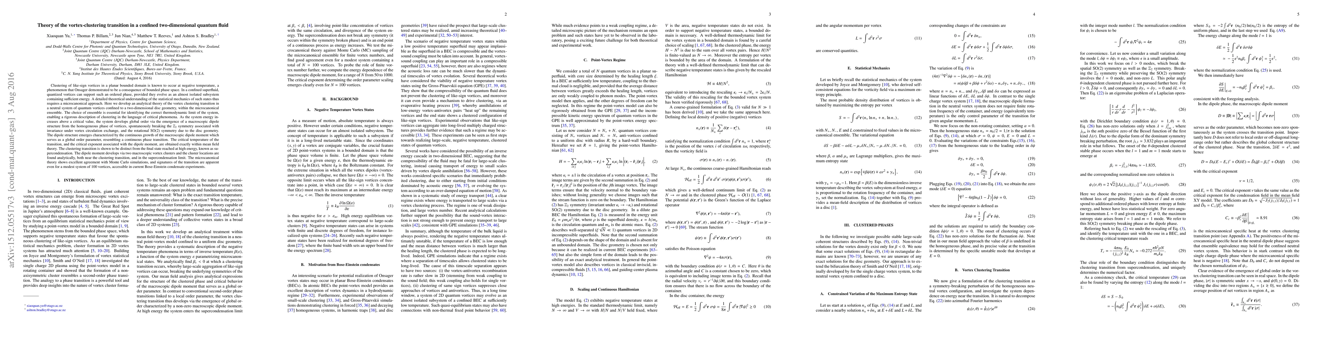 This paper develops an analytical theory for the vortex-clustering transition in a confined two-dimensional quantum fluid, showing that as energy increases, a macroscopic dipole structure emerges, breaking symmetries and marking a continuous phase transition. The critical temperature and exponent are obtained exactly, and the transition is distinct from supercondensation.