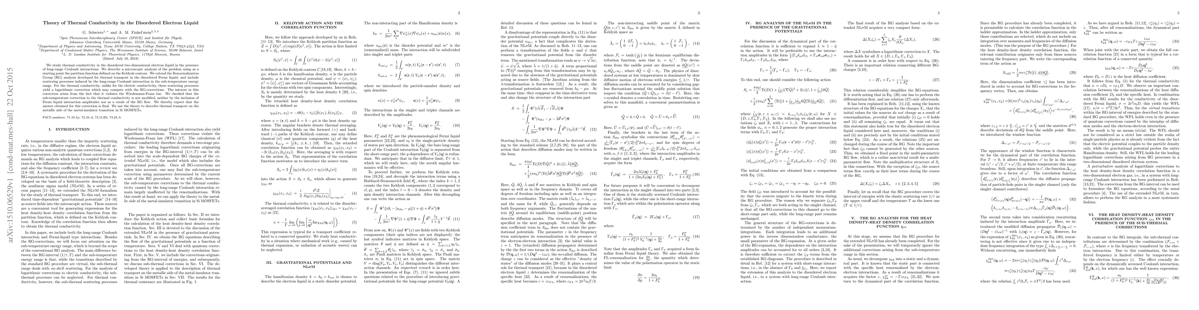 We study thermal conductivity in the disordered two-dimensional electron liquid in the presence of long-range Coulomb interactions. We describe a microscopic analysis of the problem using as a starting point the partition function defined on the Keldysh contour. We extend the Renormalization Group (RG) analysis developed for thermal transport in the disordered Fermi liquid, and include scattering processes induced by the long-range Coulomb interaction in the sub-temperature energy range. For the thermal conductivity, unlike for the electric conductivity, these scattering processes yield a logarithmic correction which may compete with the RG-corrections. The interest in this correction arises from the fact that it violates the Wiedemann-Franz law. We checked that the sub-temperature correction to the thermal conductivity is not modified, neither by the inclusion of Fermi liquid interaction amplitudes nor as a result of the RG flow. We thereby expect that the answer obtained for this correction is final. We use the theory to describe thermal transport on the metallic side of the metal-insulator transition in Si MOSFETs.