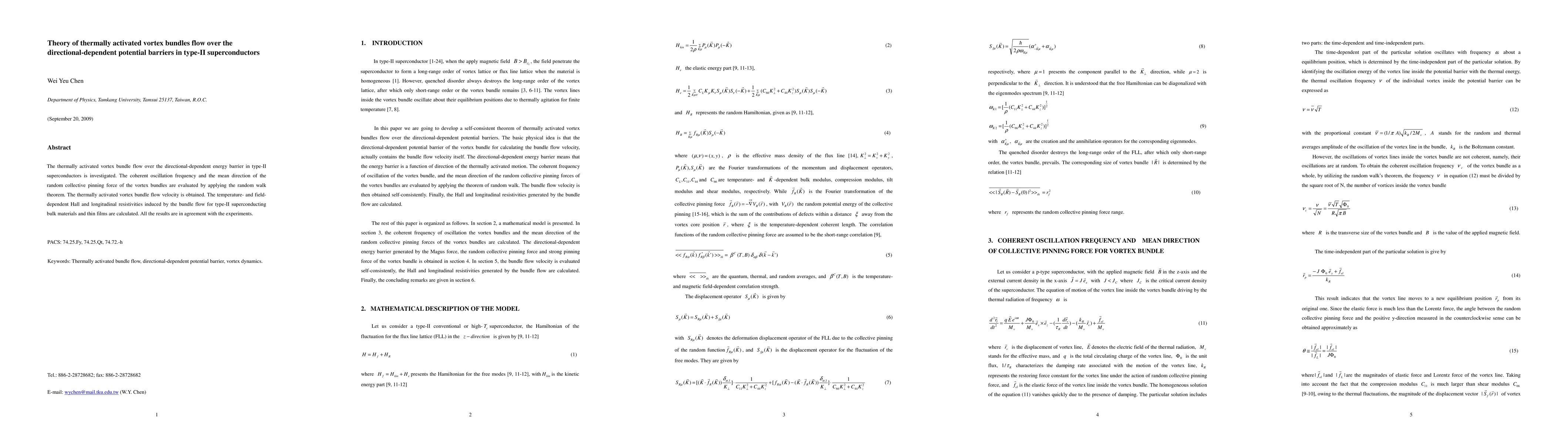 This paper investigates the thermally activated flow of vortex bundles over directional-dependent potential barriers in type-II superconductors, evaluating their coherent oscillation frequency and mean pinning force direction via random walk theory. It calculates temperature- and field-dependent resistivities and finds agreement with experimental results.