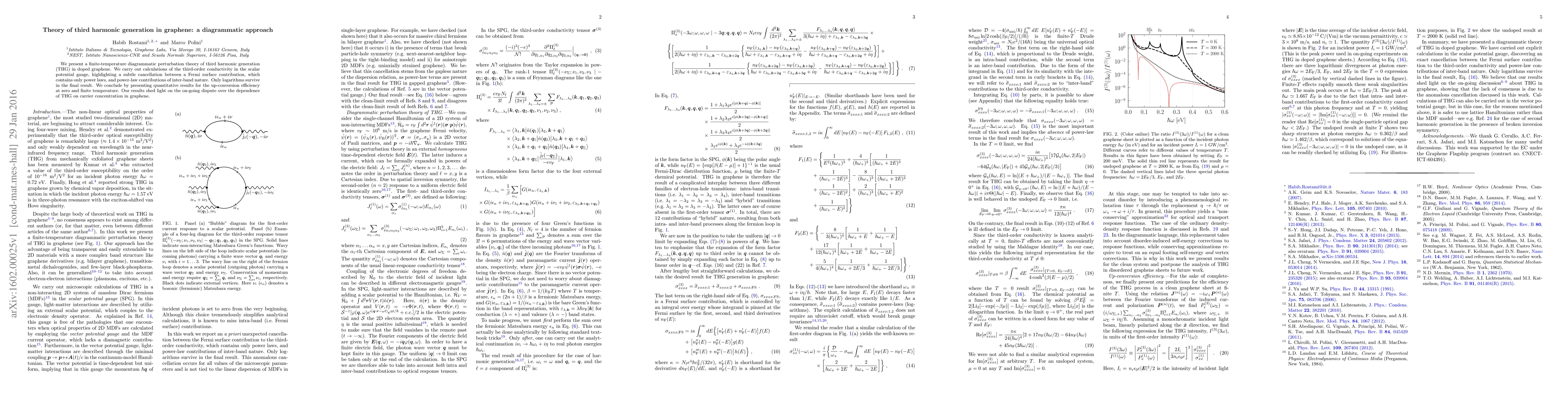This paper develops a finite-temperature diagrammatic perturbation theory for third harmonic generation in doped graphene, revealing a cancellation between Fermi surface and inter-band contributions, resulting in logarithmic terms in the final conductivity calculation. It provides quantitative results for THG efficiency and resolves debates on its dependence on carrier concentration.