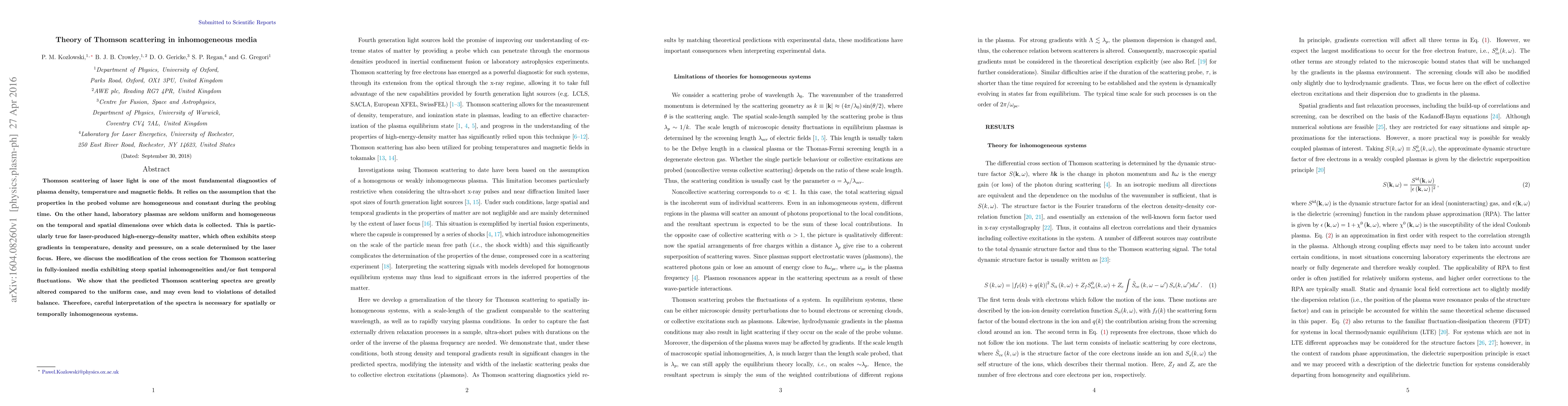 This paper examines the modification of Thomson scattering in inhomogeneous plasmas, showing that spatial inhomogeneities and temporal fluctuations significantly alter scattering spectra compared to homogeneous conditions, necessitating careful spectral interpretation.