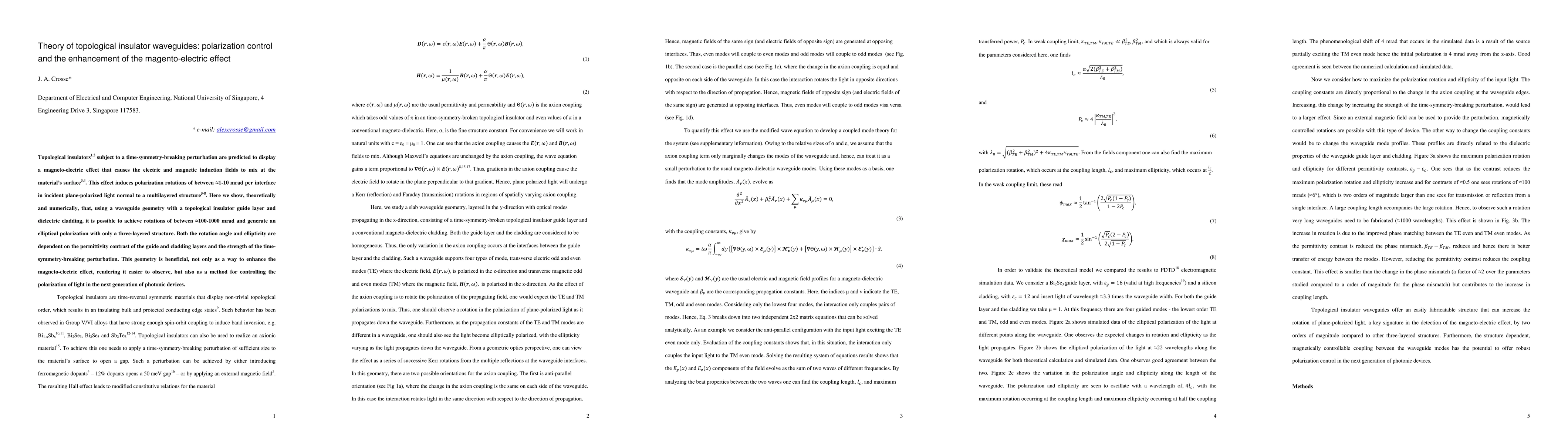 Topological insulators subject to a time-symmetry-breaking perturbation are predicted to display a magneto-electric effect that causes the electric and magnetic induction fields to mix at the material's surface. This effect induces polarization rotations of between ~1-10 mrad per interface in incident plane-polarized light normal to a multilayered structure. Here we show, theoretically and numerically, that, using a waveguide geometry with a topological insulator guide layer and dielectric cladding, it is possible to achieve rotations of between ~100-1000 mrad and generate an elliptical polarization with only a three-layered structure. Both the rotation angle and ellipticity are dependent on the permittivity contrast of the guide and cladding layers and the strength of the time-symmetry-breaking perturbation. This geometry is beneficial, not only as a way to enhance the magneto-electric effect, rendering it easier to observe, but also as a method for controlling the polarization of light in the next generation of photonic devices.