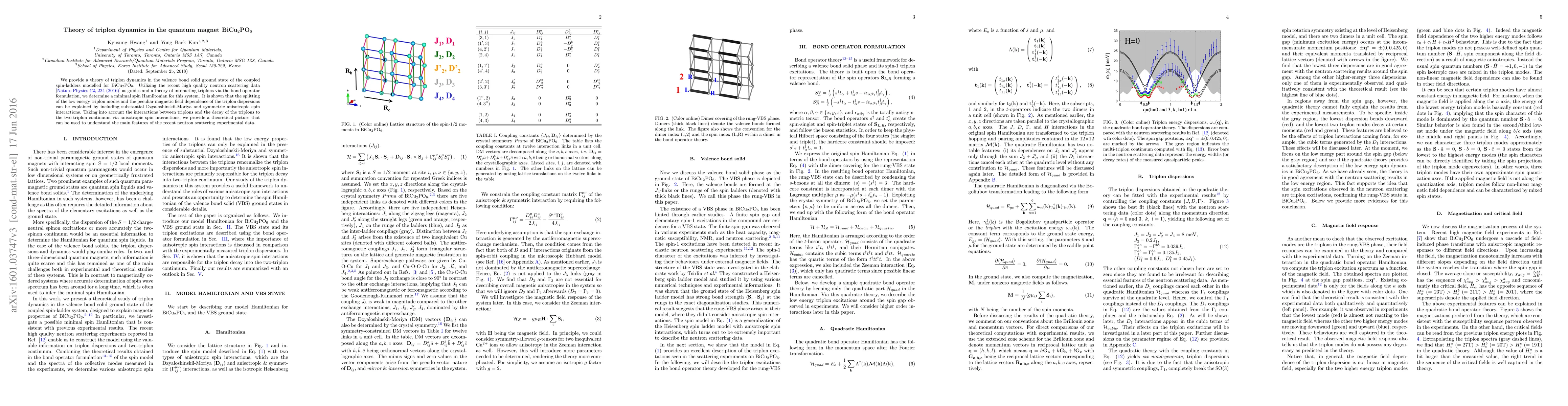 We provide a theory of triplon dynamics in the valence bond solid ground state of the coupled spin-ladders modelled for BiCu$_2$PO$_6$. Utilizing the recent high quality neutron scattering data [Nature Physics (2015), DOI: 10.1038/NPHYS3566] as guides and a theory of interacting triplons via the bond operator formulation, we determine a minimal spin Hamiltonian for this system. It is shown that the splitting of the low energy triplon modes and the peculiar magnetic field dependence of the triplon dispersions can be explained by including substantial Dzyaloshinskii-Moriya and symmetric anisotropic spin interactions. Taking into account the interactions between triplons and the decay of the triplons to the two-triplon continuum via anisotropic spin interactions, we provide a theoretical picture that can be used to understand the main features of the recent neutron scattering experimental data.