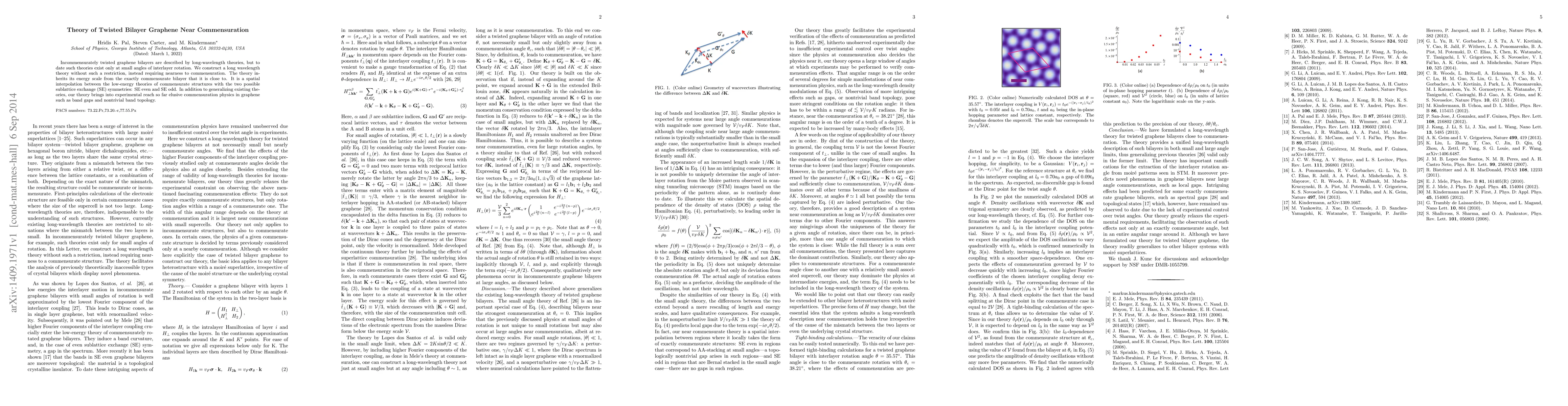 This paper develops a long-wavelength theory for incommensurately twisted bilayer graphene near commensuration, generalizing existing theories to larger rotation angles. It enables the study of previously inaccessible commensuration physics, including band gaps and nontrivial band topology.