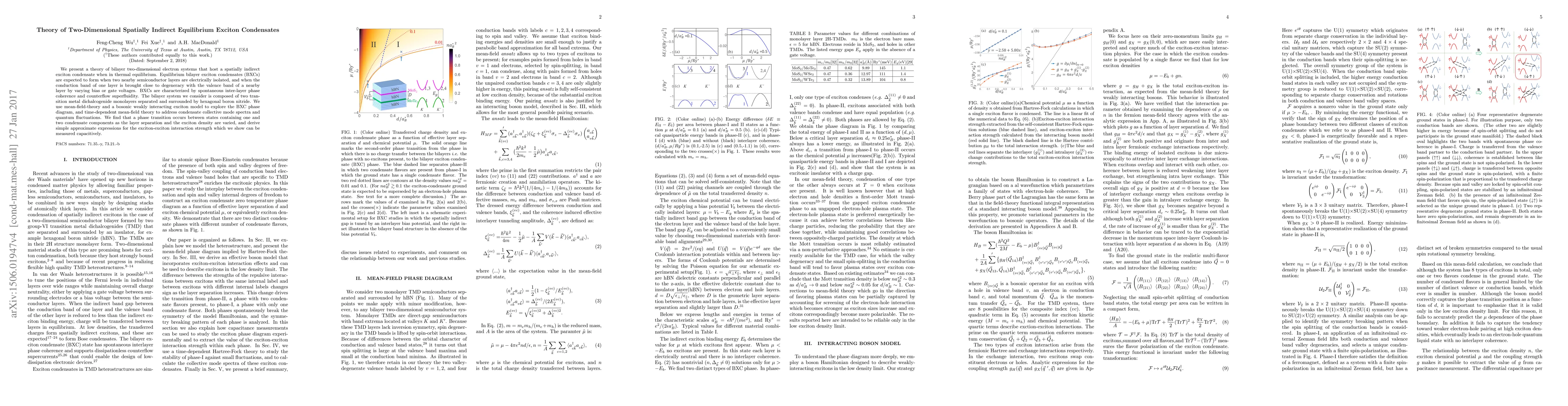 This paper presents a theory for bilayer two-dimensional electron systems forming spatially indirect exciton condensates in thermal equilibrium, characterized by inter-layer phase coherence and counterflow superfluidity. Using mean-field theory and a bosonic model, the authors explore the BXC phase diagram and find a phase transition between single and dual condensate states, with implications for capacitively measurable exciton-exciton interactions.